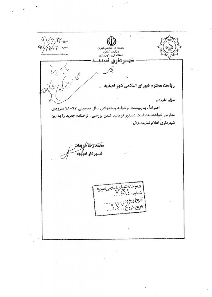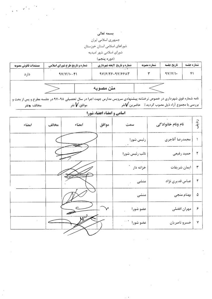 مصوبه شماره ۳ جلسه شماره ۴۱ شورای اسلامی شهر امیدیه