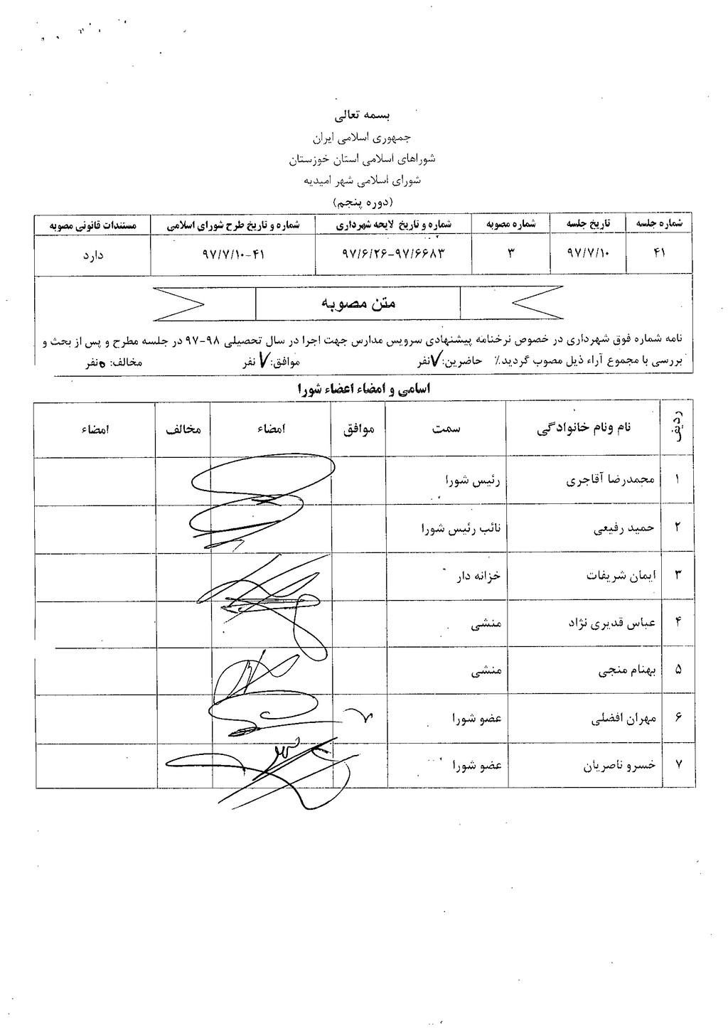 مصوبه شماره ۳جلسه شماره ۴۱ مورخ ۹۷/۷/۱۰ شورای اسلامی شهر امیدیه