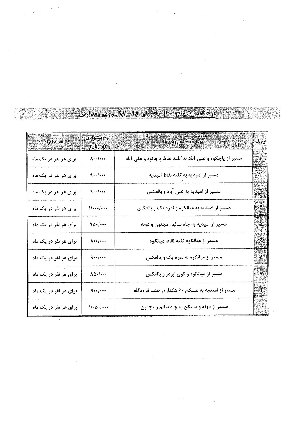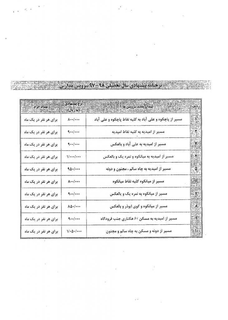 نامه شماره فوق شهرداری در خصوص نرخنامه پیشنهادی سرویس مدارس جهت اجرا در سال تحصیلی ۹۸-۹۷ در جلسه مطرح و پس از بحث و بررسی با مجموع آراء ذیل مصوب گردید%