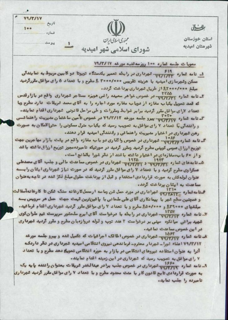 مصوبه شماره ۳ جلسه شماره ۱۰۰ شورای اسلامی شهر امیدیه