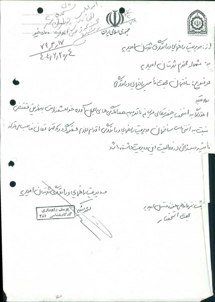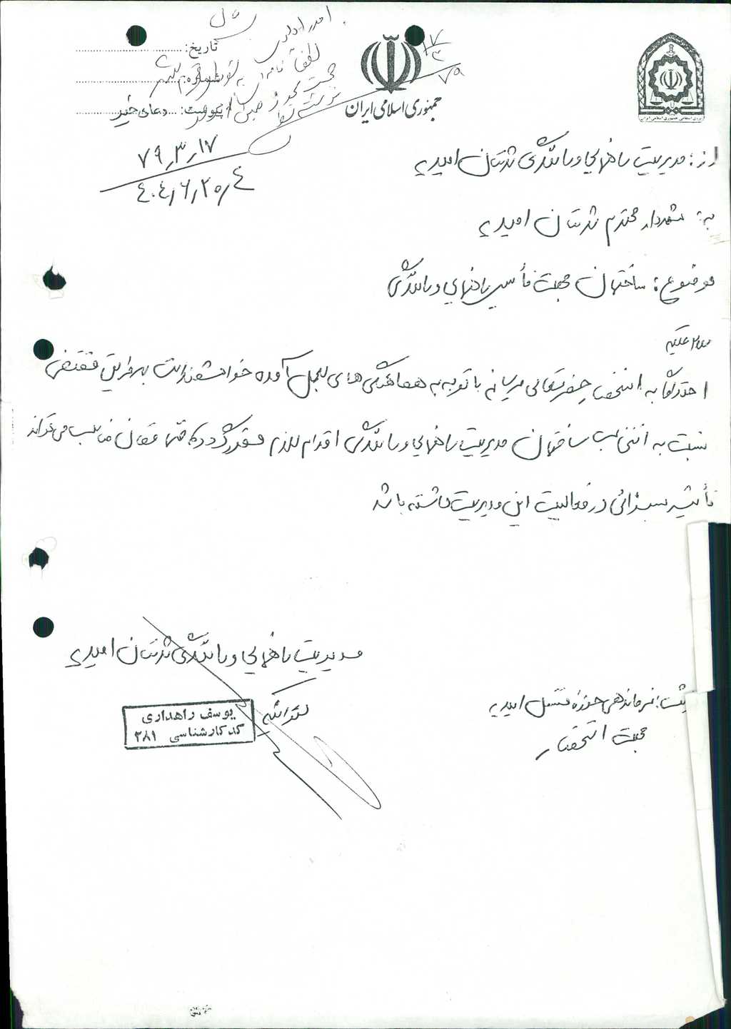 ۳-نامه شماره ۳۰۲۰مورخ ۱۷/ ۳/ ۷۹پيرو جلسه مورخ ۱۲/ ۳/ ۷۹در خصوص تأمين ساختمان مديريت راهنمايي و رانندگي با تعداد ۷ رأي موافق به تصويب رسيد كه يكباب منزل مسكوني را حتي الامكان به صورت رهن شهرداري در اختيار مديريت راهنمايي و رانندگي اميديه قراردهند.