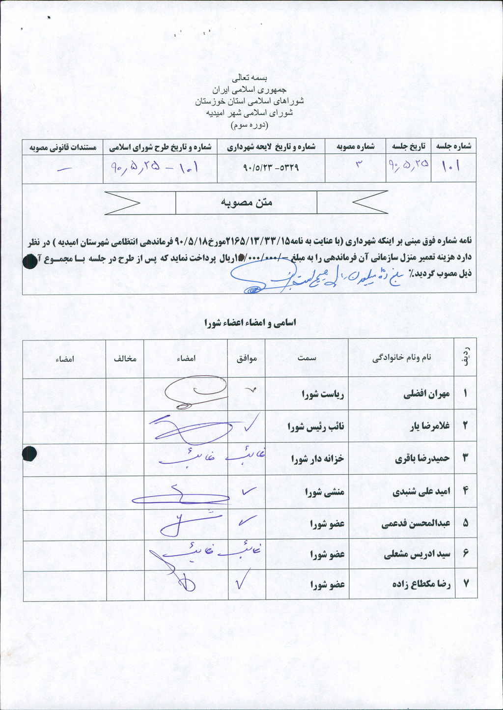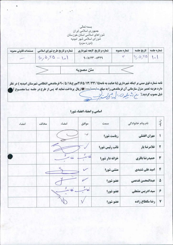 مصوبه شماره ۳ جلسه شماره ۱۰۱ شورای اسلامی شهر امیدیه