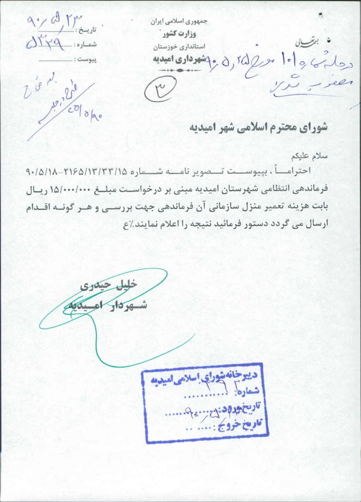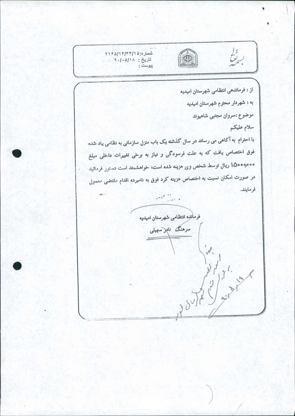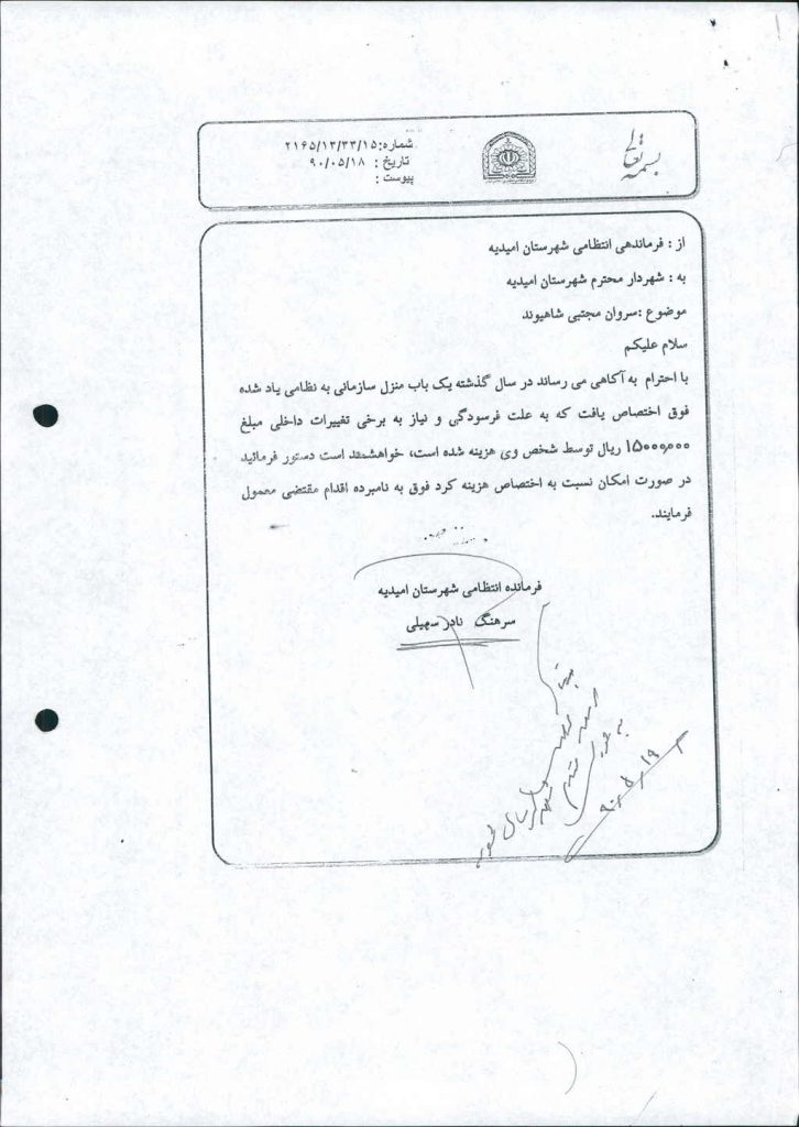نامه شماره فوق مبنی بر اینکه شهرداری (با عنایت به نامه۱۵/ ۳۳/ ۱۳/ ۲۱۶۵مورخ۱۸ /۵/ ۹۰ فرماندهی انتظامی شهرستان امیدیه ) در نظر دارد هزینه تعمیر منزل سازمانی آن فرماندهی را به مبلغ(ده میلیون ریال) -/۰۰۰/۰۰۰/ ۱۰ريال پرداخت نماید که پس از طرح در جلسه با مجموع آراء ذیل مصوب گردید%