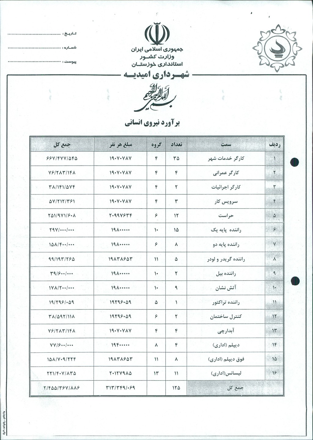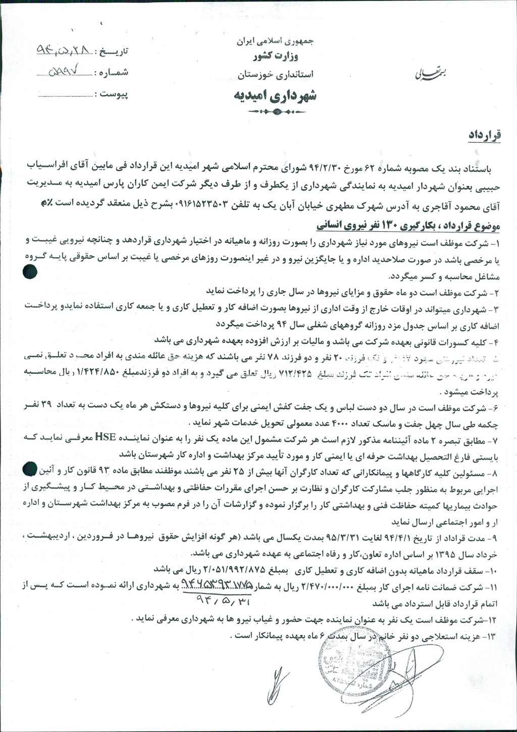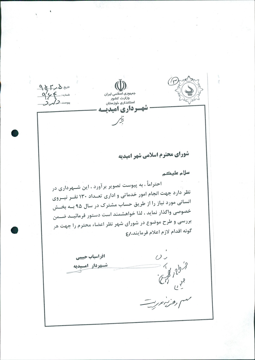 نامه شماره فوق شهرداری مبنی براینکه شهرداری درنظر دارد امور خدماتی و اداری خودرا به تعداد ۱۳۰نفر نیروی انسانی مورد نیاز را ازطریق حساب مشترک(سهم وهزینه مدیریت)درسال ۹۵را به بخش خصوصی واگذار نماید.لذا موضوع در جلسه مطرح و پس از بحث و بررسی با مجموع آراء ذیل مصوب گردید%
