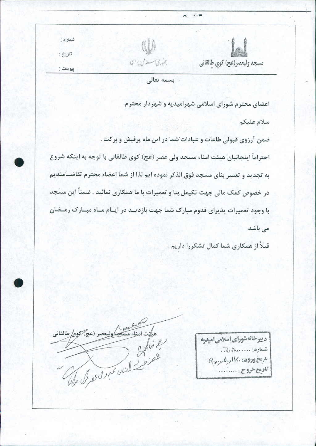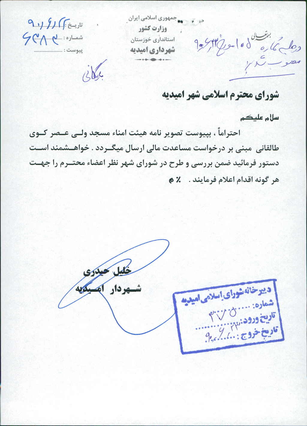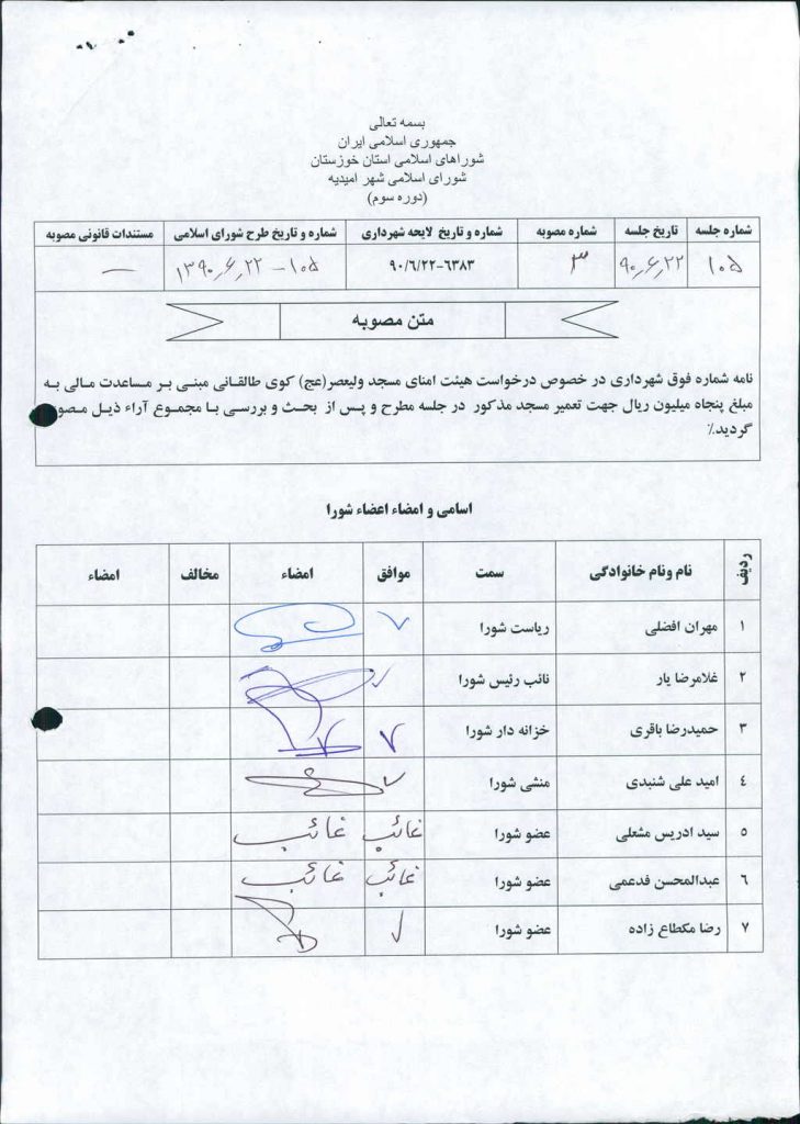 نامه شماره فوق شهرداری در خصوص درخواست هیئت امنای مسجد ولیعصر(عج) کوی طالقانی مبنی بر مساعدت مالی به مبلغ پنجاه میلیون ریال جهت تعمیر مسجد مذکور در جلسه مطرح و پس از بحث و بررسی با مجموع آراء ذیل مصوب گردید%