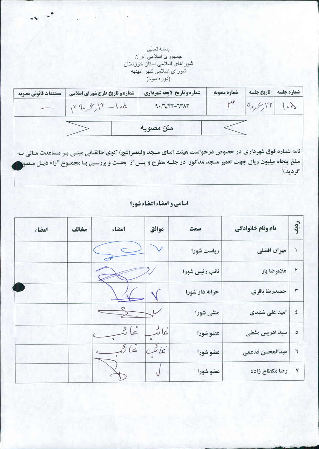مصوبه شماره ۳ جلسه شماره ۱۰۵ شورای اسلامی شهر امیدیه