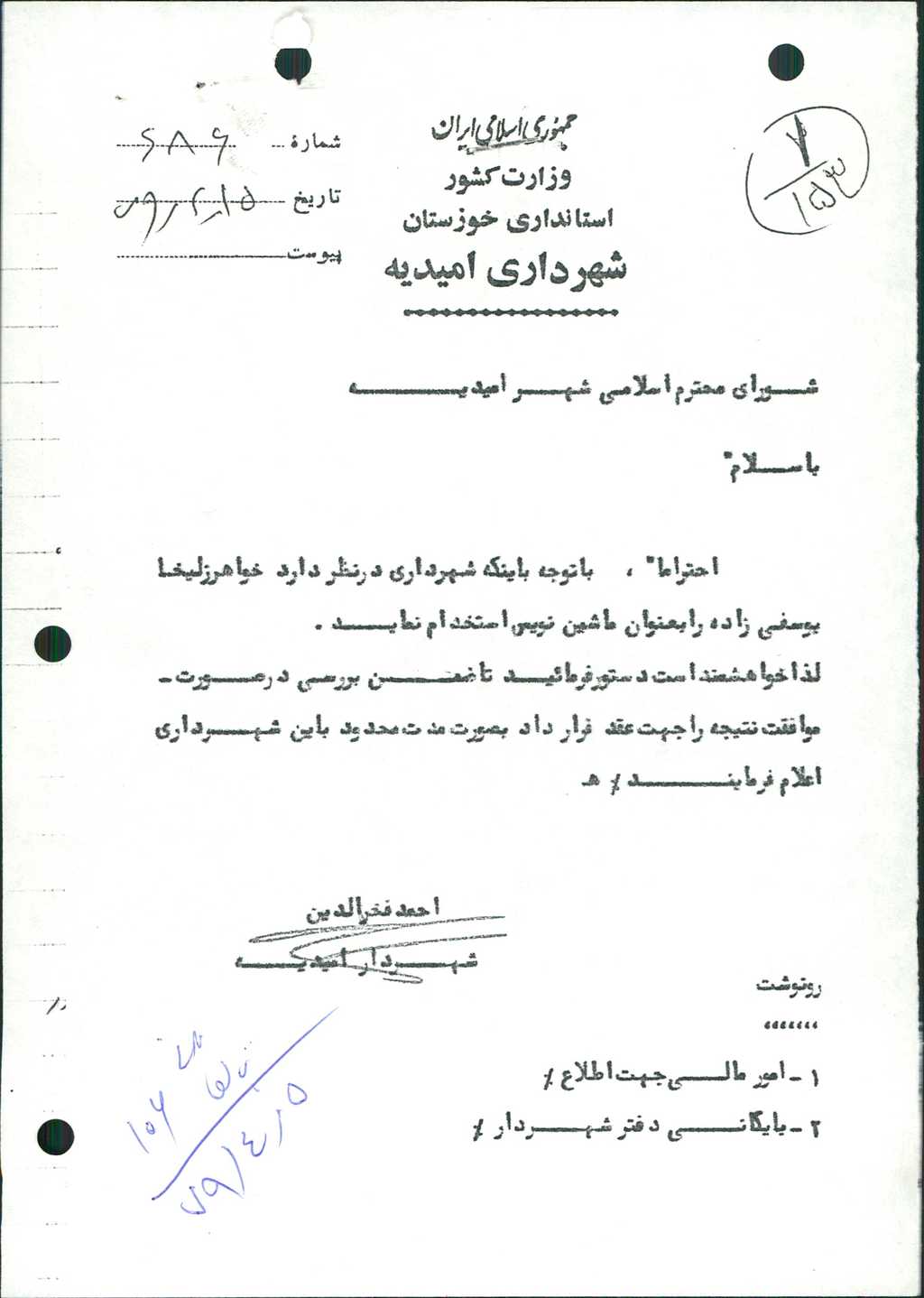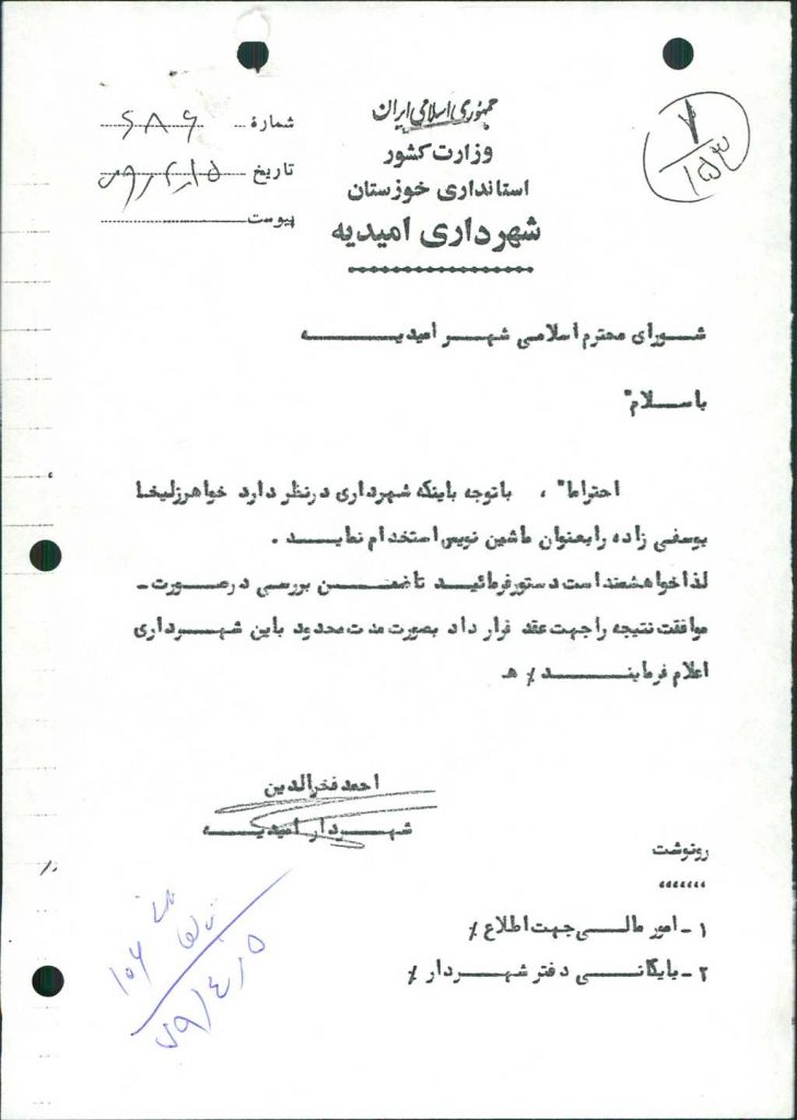 مصوبه شماره ۳ جلسه شماره ۱۰۶ مورخ ۷۹/۴/۵ شورای اسلامی شهر امیدیه