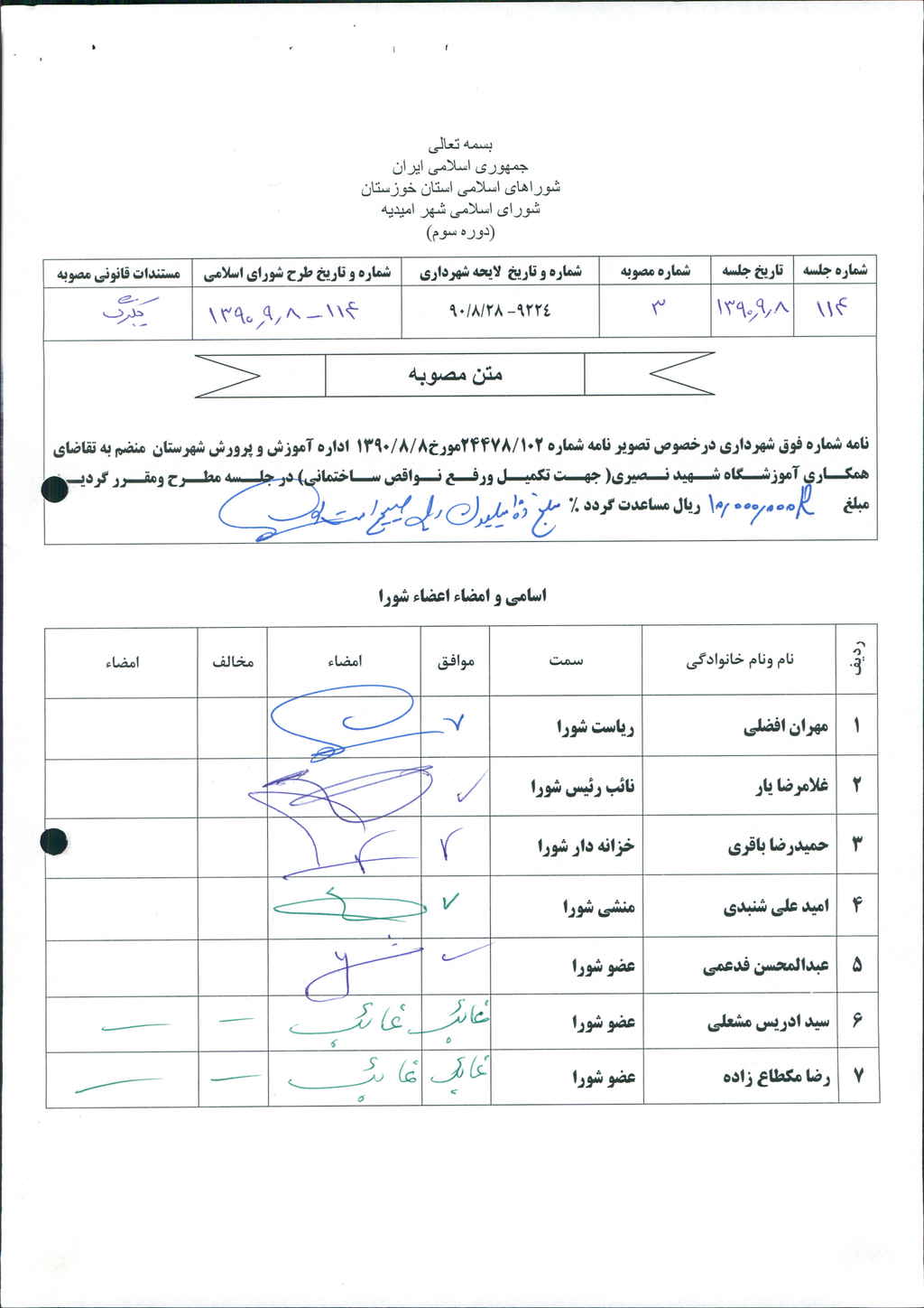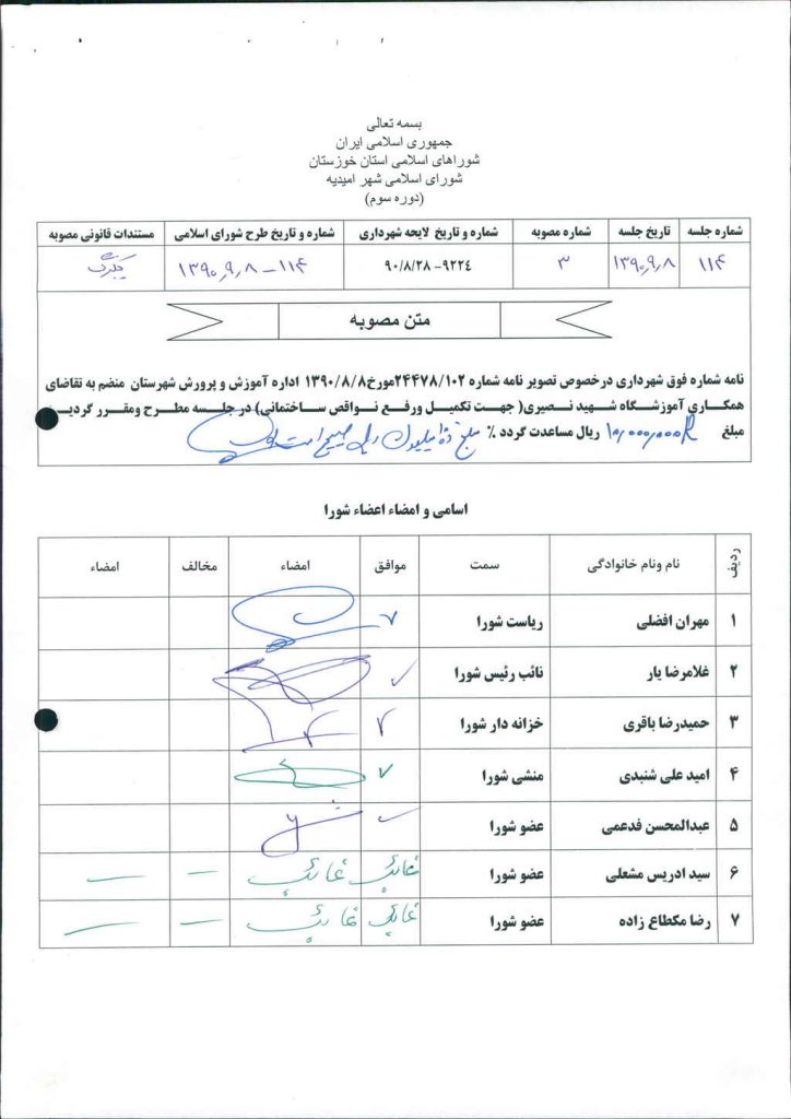 مصوبه شماره ۳ جلسه شماره ۱۱۴ شورای اسلامی شهر امیدیه