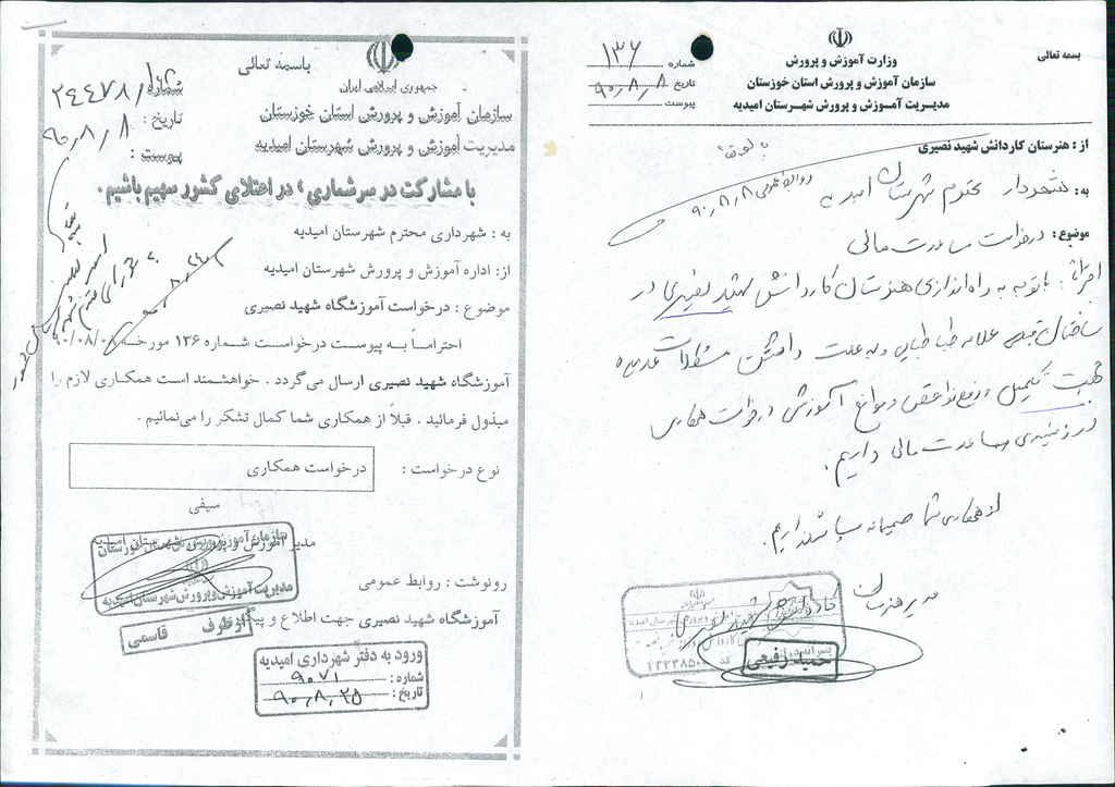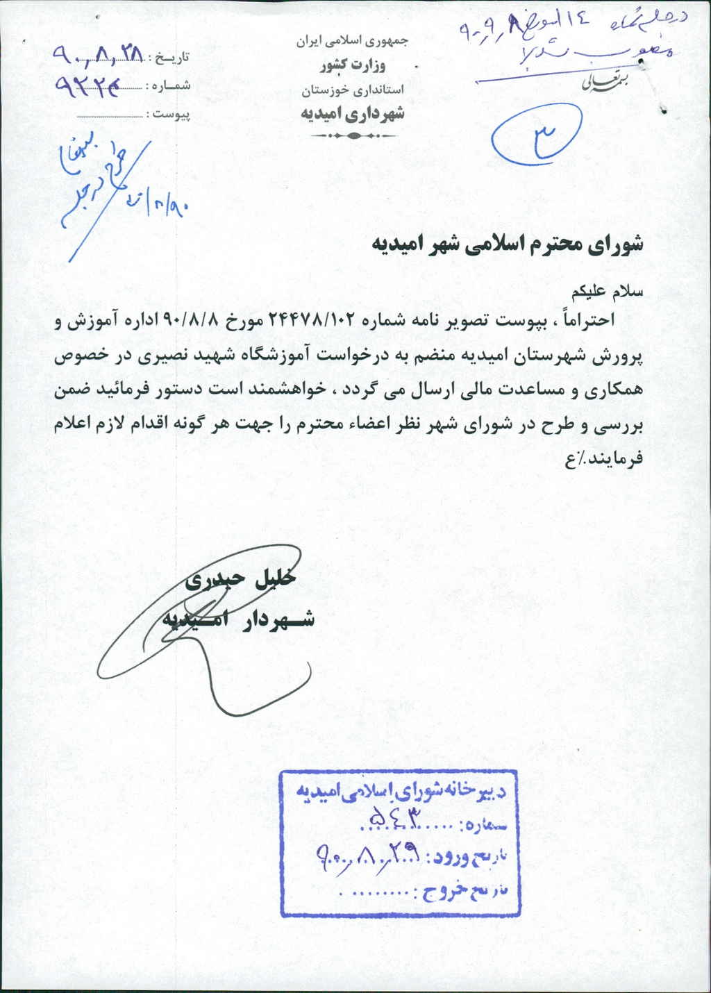 نامه شماره فوق شهرداری درخصوص تصویر نامه شماره ۱۰۲/ ۲۴۴۷۸مورخ۸/۸/ ۱۳۹۰ اداره آموزش و پرورش شهرستان منضم به تقاضای همکاری آموزشگاه شهید نصیری( جهت تکمیل ورفع نواقص ساختمانی) در جلسه مطرح ومقرر گردید مبلغ -/۰۰۰/۰۰۰/ ۱۰ريال (ده میلیون ریال )مساعدت گردد.