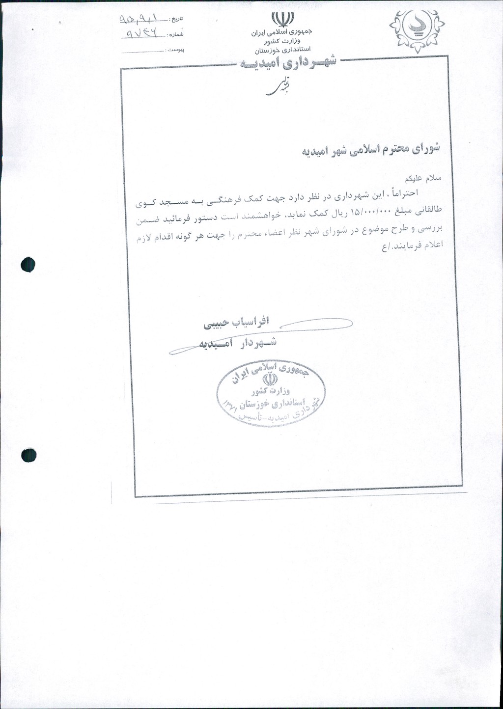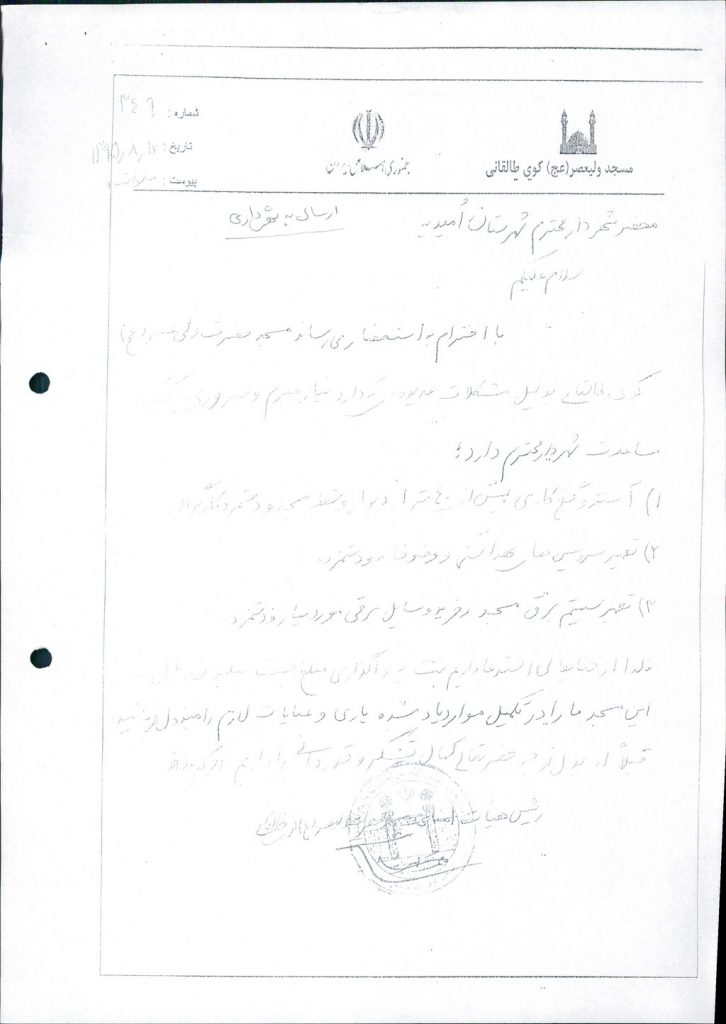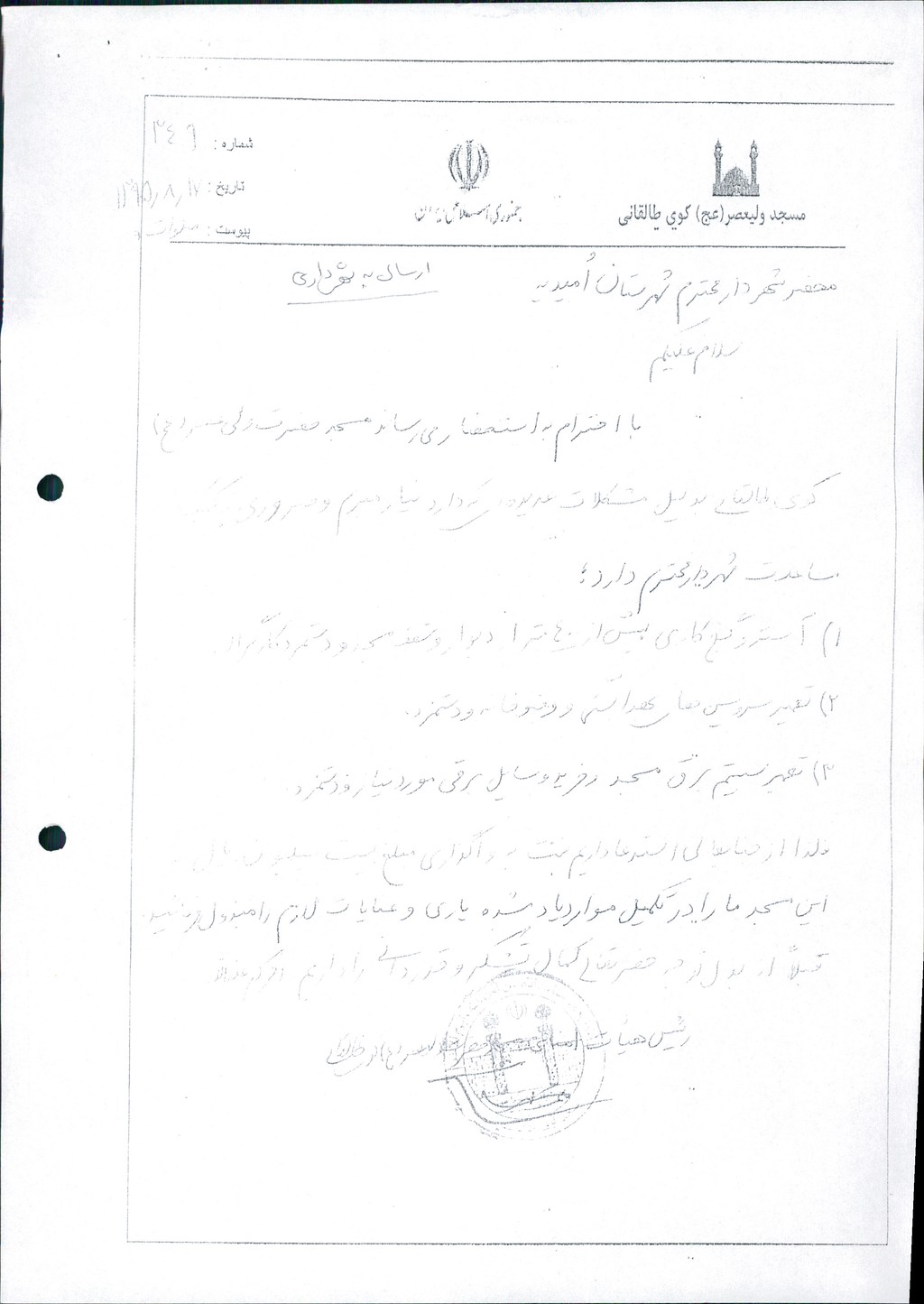 نامه شماره فوق شهرداری در خصوص مساعدت مالی به مبلغ ۱۵۰۰۰۰۰۰ ریال به مسجد ولیعصر (عج)کوی طالقانی با عنایت به درخواست هیئت امنای مسجد و بدلیل مشکلات و نیاز مبرم و ضروری ،موضوع در جلسه مطرح و پس از بحث و بررسی با مجموع آراء ذیل مصوب گردید%