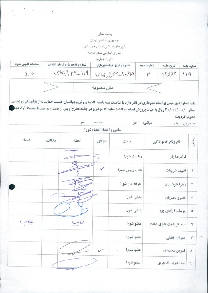 مصوبه شماره ۳ جلسه شماره ۱۱۹ شورای اسلامی شهر امیدیه