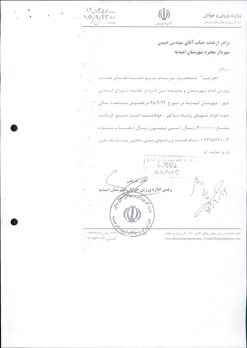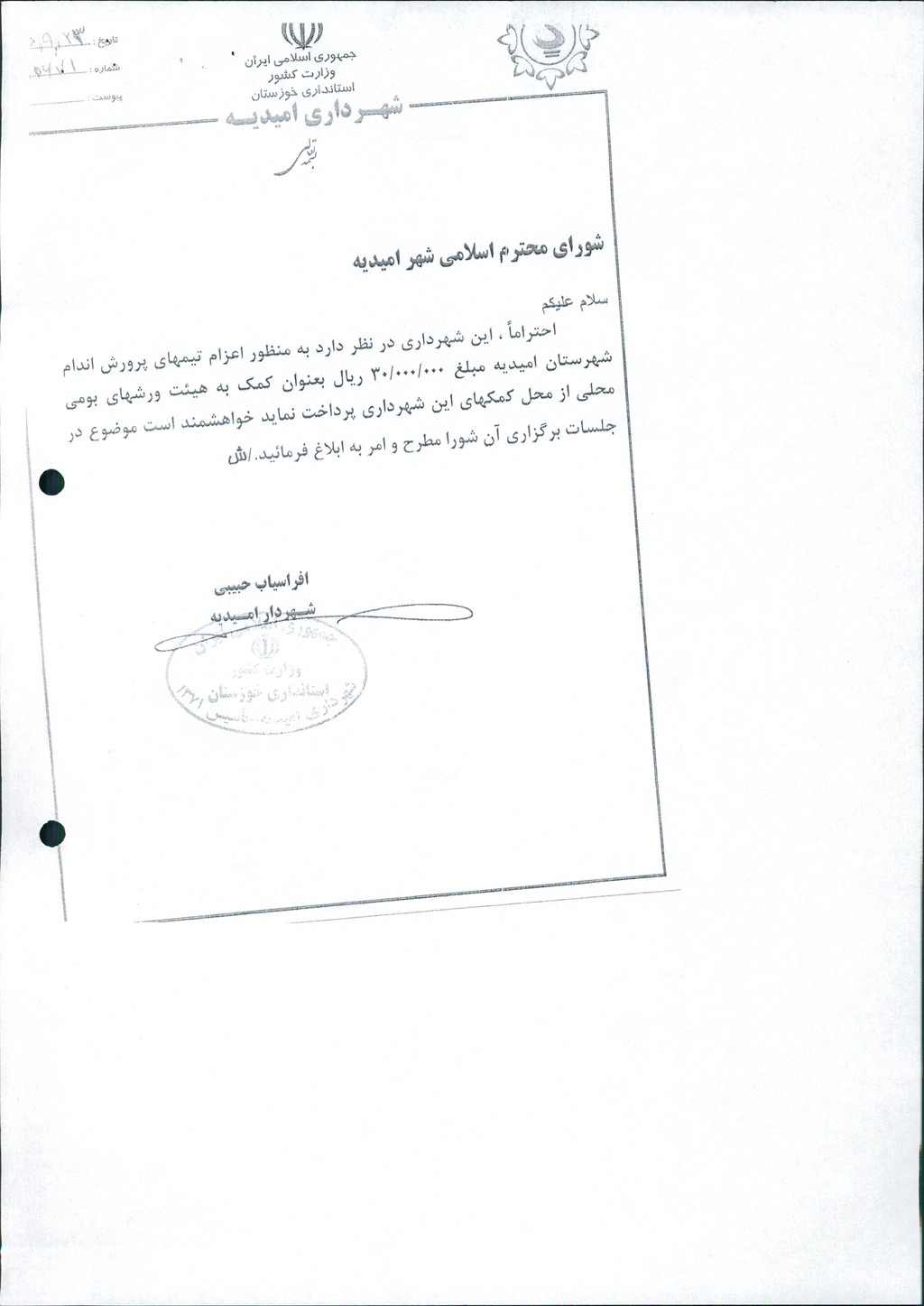 نامه شماره فوق شهرداری مبنی بر اینکه شهرداری در نظر دارد با عنایت به نامه اداره ورزش و جوانان جهت حمایت از هیأتهای ورزشی مبلغ ۳۰۰۰۰۰۰۰ ریال به هیأت پرورش اندام مساعدت نماید که در جلسه مطرح و پس از بحث و بررسی با مجموع آراء ذیل مصوب گردید%