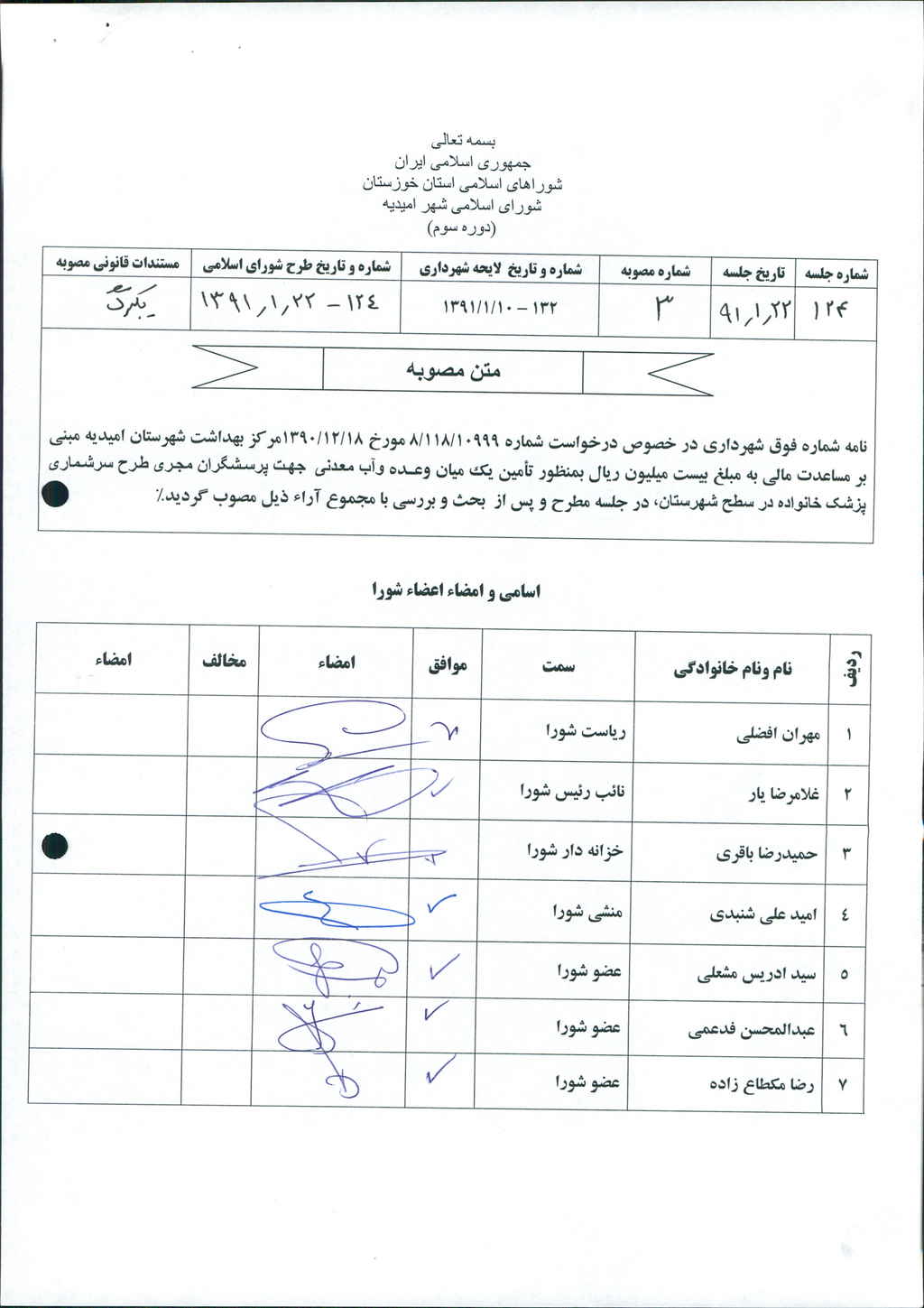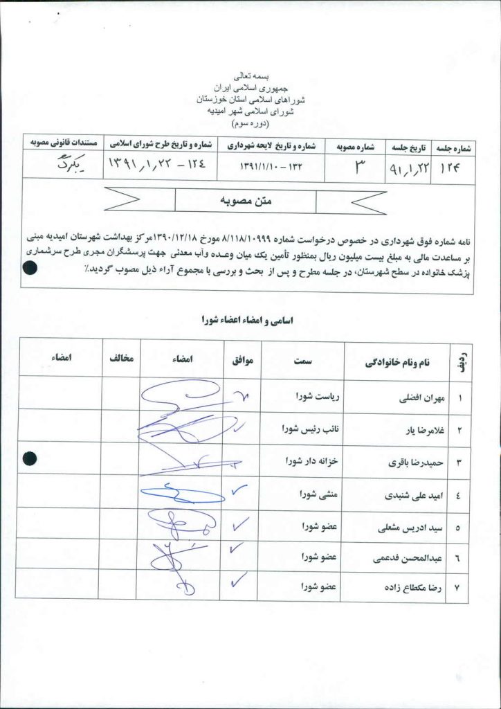 مصوبه شماره ۳ جلسه شماره ۱۲۴ شورای اسلامی شهر امیدیه