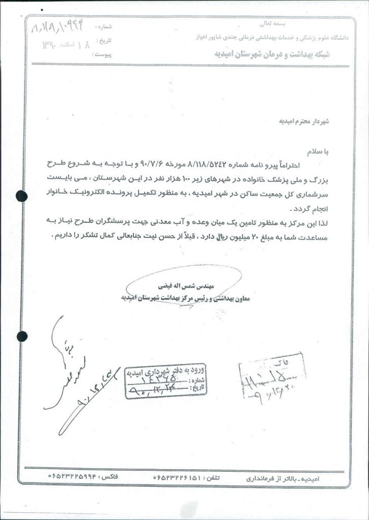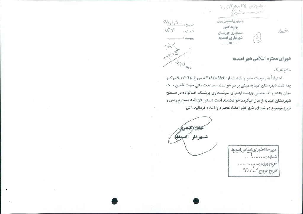 نامه شماره فوق شهرداری در خصوص درخواست شماره ۱۰۹۹۹/ ۱۱۸/ ۸ مورخ ۱۸/ ۱۲/ ۱۳۹۰مرکز بهداشت شهرستان امیدیه مبنی بر مساعدت مالی به مبلغ بیست میلیون ريال بمنظور تأمین یک میان وعده وآب معدنی جهت پرسشگران مجری طرح سرشماری پزشک خانواده در سطح شهرستان، در جلسه مطرح و پس از بحث و بررسی با مجموع آراء ذیل مصوب گردید%