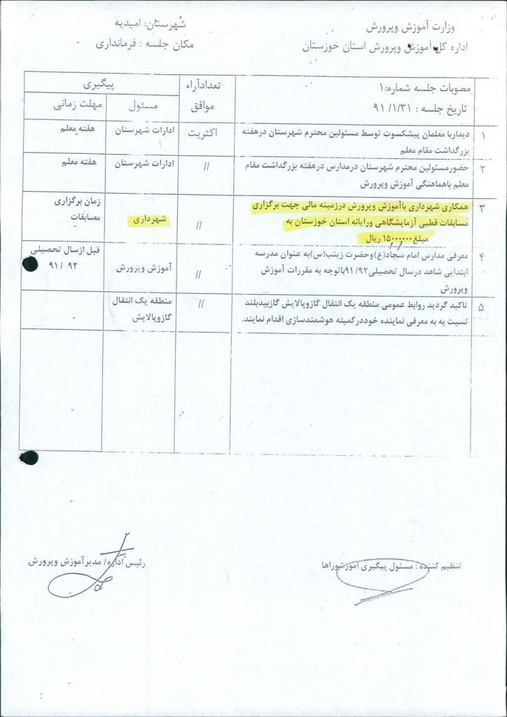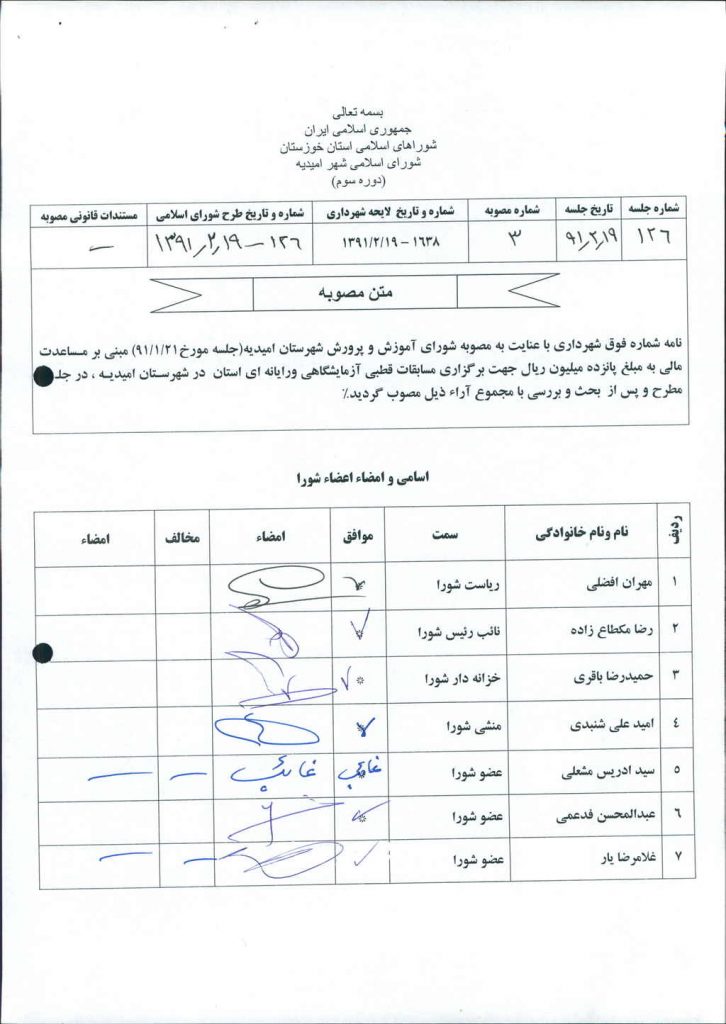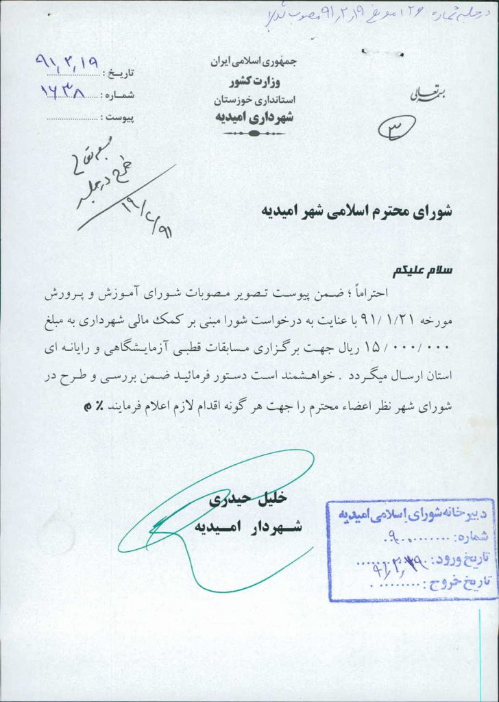 نامه شماره فوق شهرداری با عنایت به مصوبه شورای آموزش و پرورش شهرستان امیدیه(جلسه مورخ۲۱/ ۱/ ۹۱) مبنی بر مساعدت مالی به مبلغ پانزده میلیون ريال جهت برگزاری مسابقات قطبی آزمایشگاهی ورایانه ای استان در شهرستان امیدیه ، در جلسه مطرح و پس از بحث و بررسی با مجموع آراء ذیل مصوب گردید%
