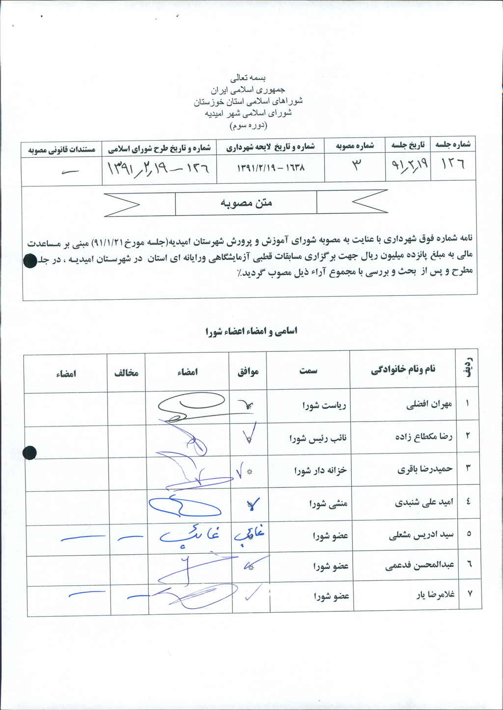 مصوبه شماره ۳ جلسه شماره ۱۲۶ شورای اسلامی شهر امیدیه
