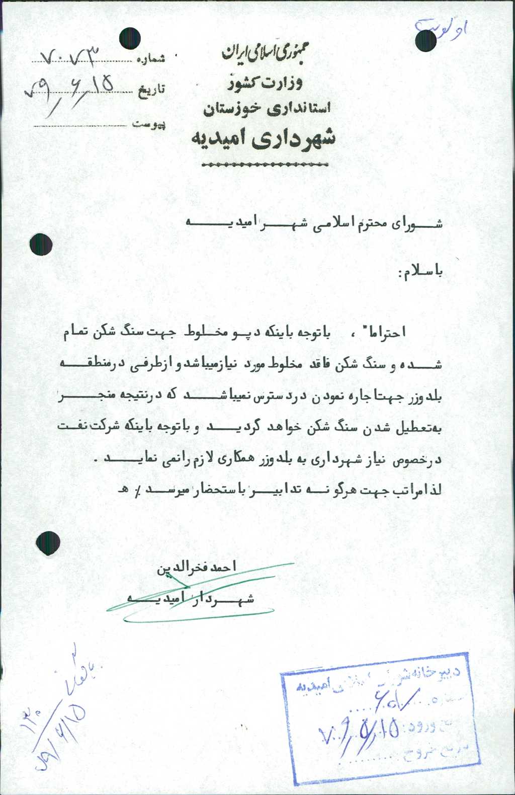 ۳-نامه شماره ۷۰۷۳مورخه ۱۵/ ۶/ ۷۹ شهرداري در خصوص درخواست اجاره يك دستگاه بلدوزر مطرح و با ۵ رأي موافق مصوب شد كه يك دستگاه بلدوزر براي مدت ۱۵ روز اجاره شود.