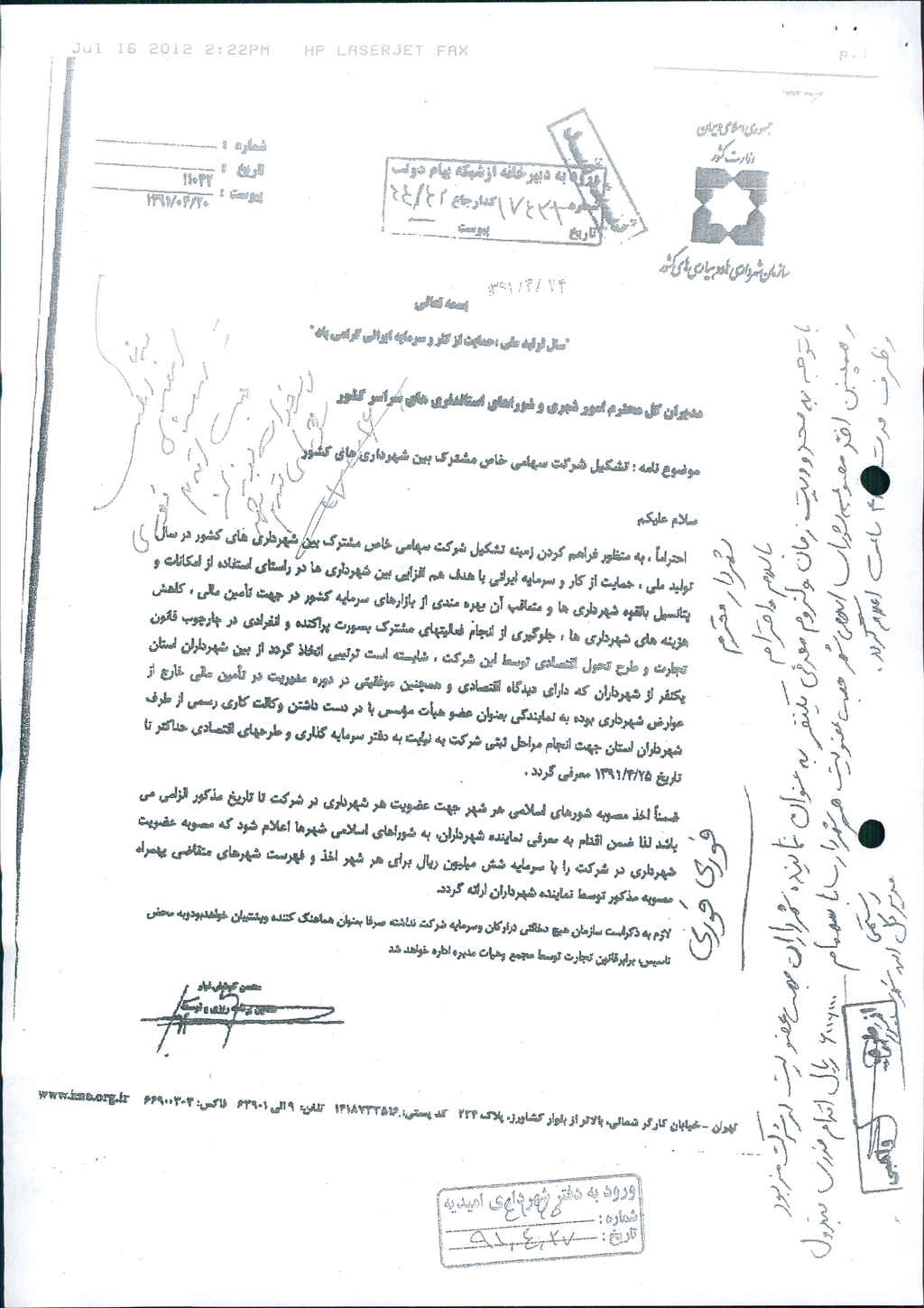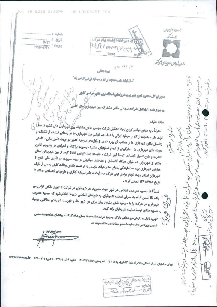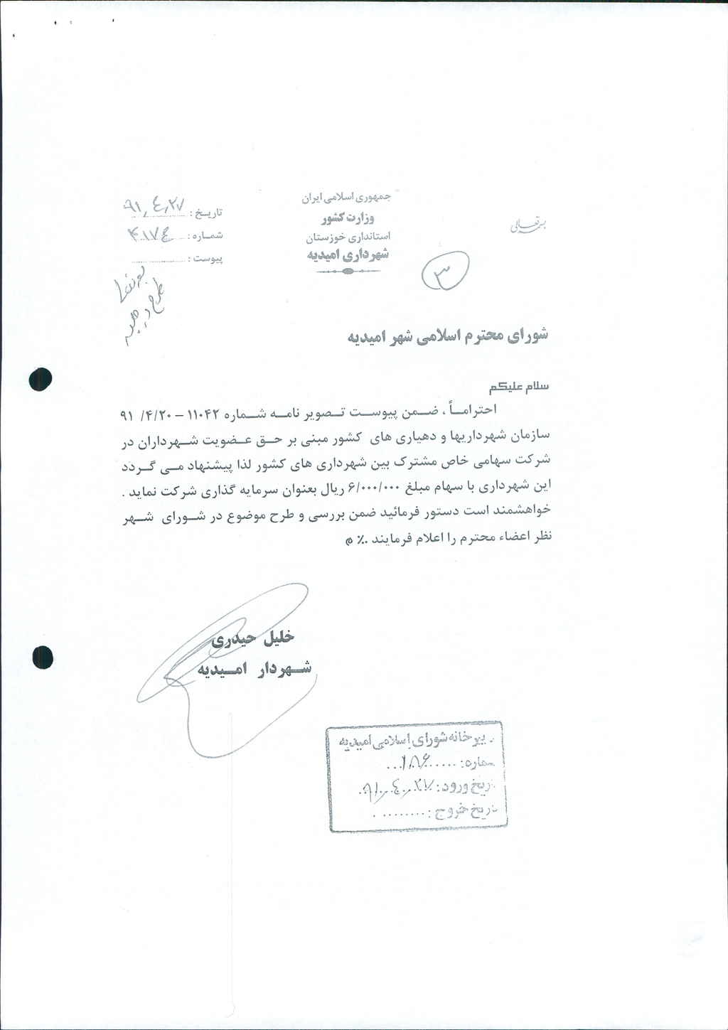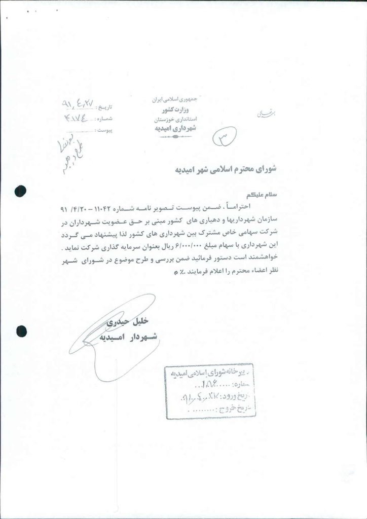 نامه شماره فوق مبنی بر اینکه باعنایت به نامه شماره ۱۱۰۴۲ مورخ ۲۰/۴/۹۱ سازمان شهرداریها ودهیاری های کشور مبنی بر حق عضویت شهرداران در شرکت سهامی خاص مشترک بین شهرداریهای کشور لذا شهرداری درنظر دارد باسهامی به  مبلغ -/۰۰۰/۰۰۰/ ۶ریال (شش میلیون ریال) سرمایه گذاری کند ،که پس از بحث و بررسی با مجموع آراء ذیل مصوب گردید%