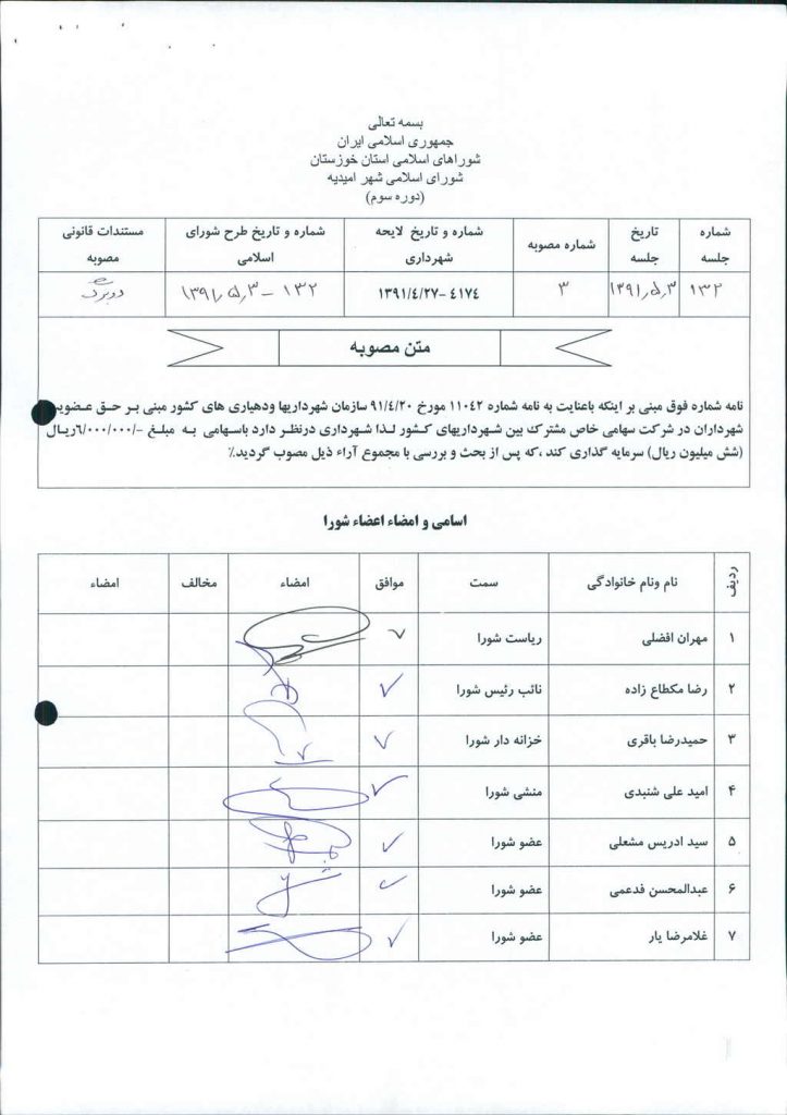 مصوبه شماره ۳ جلسه شماره ۱۳۲ شورای اسلامی شهر امیدیه