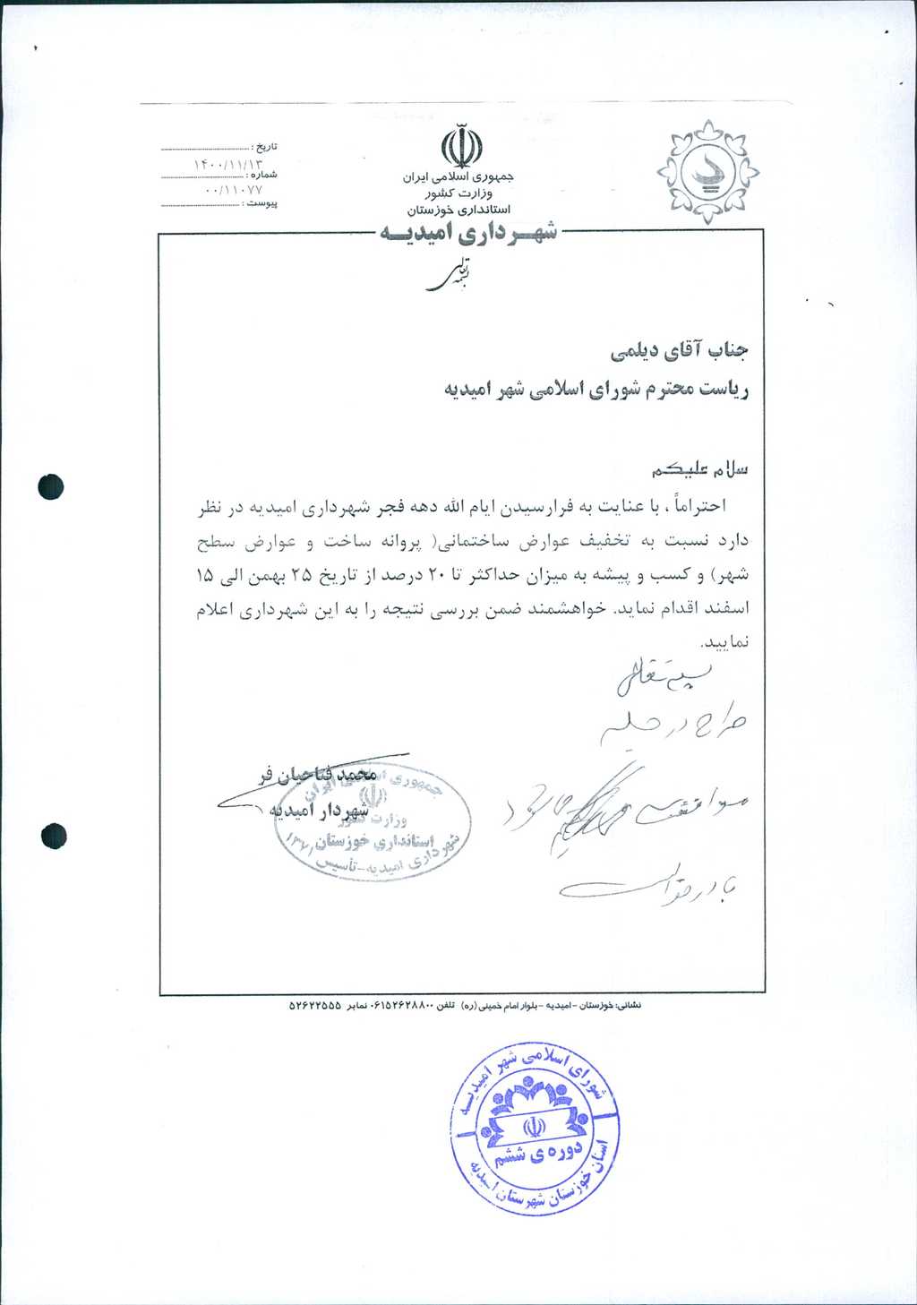 نامه شماره فوق مبنی بر اینکه شهرداری امیدیه در نظر دارد به مناسبت فرا رسیدن ایام الله دهه فجر نسبت به تخفیف عوارض ساختمانی (پروانه ساخت و عوارض سطح شهر) و کسب و پیشه به میزان حداکثر ۲۰درصد از تاریخ ۲۵ بهمن الی ۱۵ اسفند اقدام نماید، موضوع در جلسه مطرح و پس از بحث و بررسی با مجموع آراء ذیل مصوب گردید.