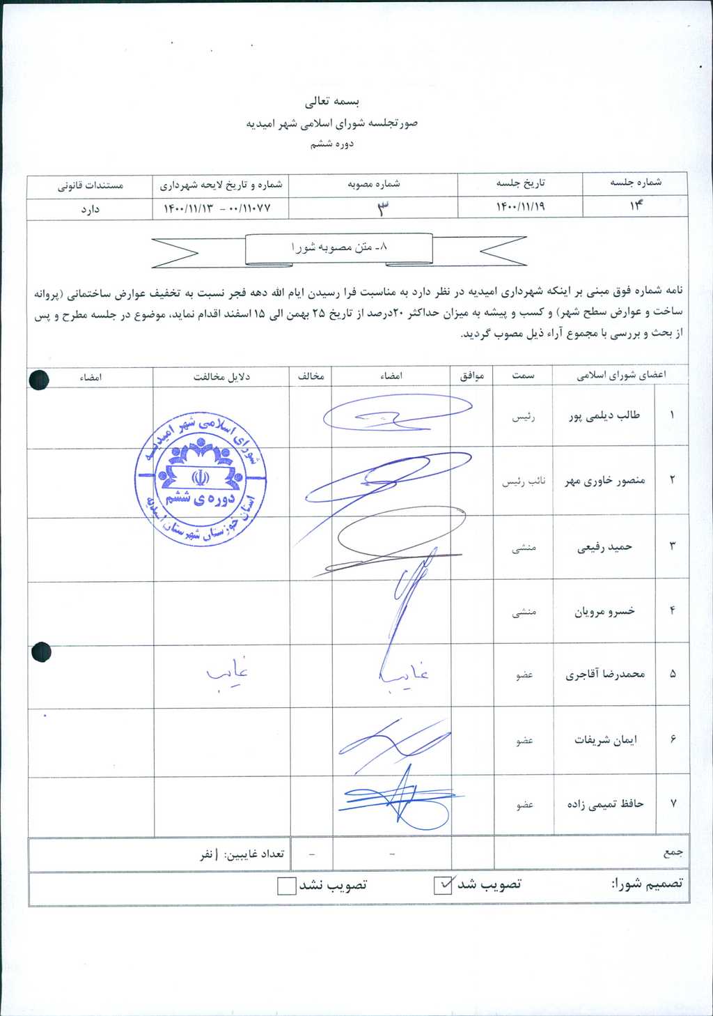 مصوبه شماره ۳ جلسه شماره ۱۴ شورای اسلامی شهر امیدیه