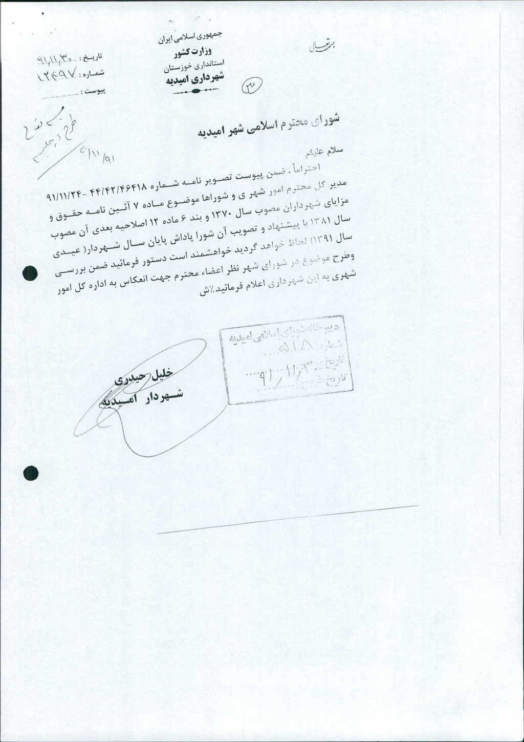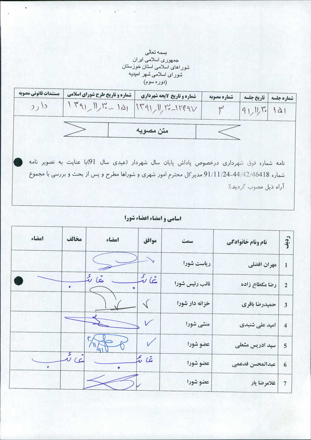 مصوبه شماره ۳ جلسه شماره ۱۵۱ شورای اسلامی شهر امیدیه