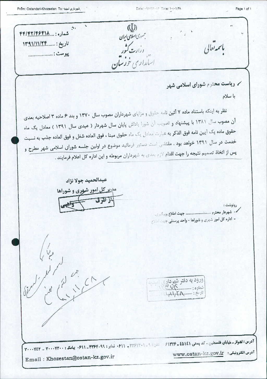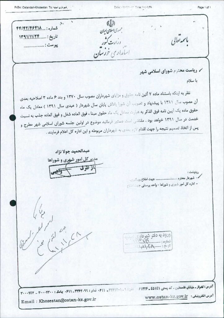 نامه شماره فوق شهرداری در خصوص پاداش پایان سال شهردار (عیدی سال۹۱) با عنایت به تصویرنامه شماره ۴۶۴۱۸/ ۴۲/ ۴۴مورخ ۲۴/ ۱۱/ ۹۱ مدیر کل محترم امور شهری و شوراها مطرح و پس از بحث و بررسی با مجموع آراء ذیل مصوب گردید%