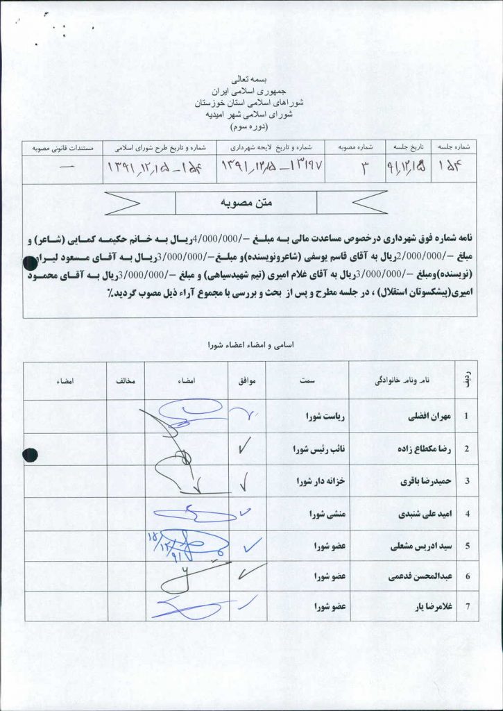 مصوبه شماره ۳ جلسه شماره ۱۵۴ شورای اسلامی شهر امیدیه