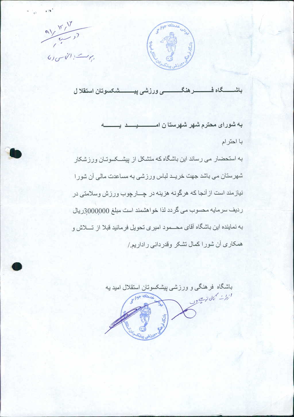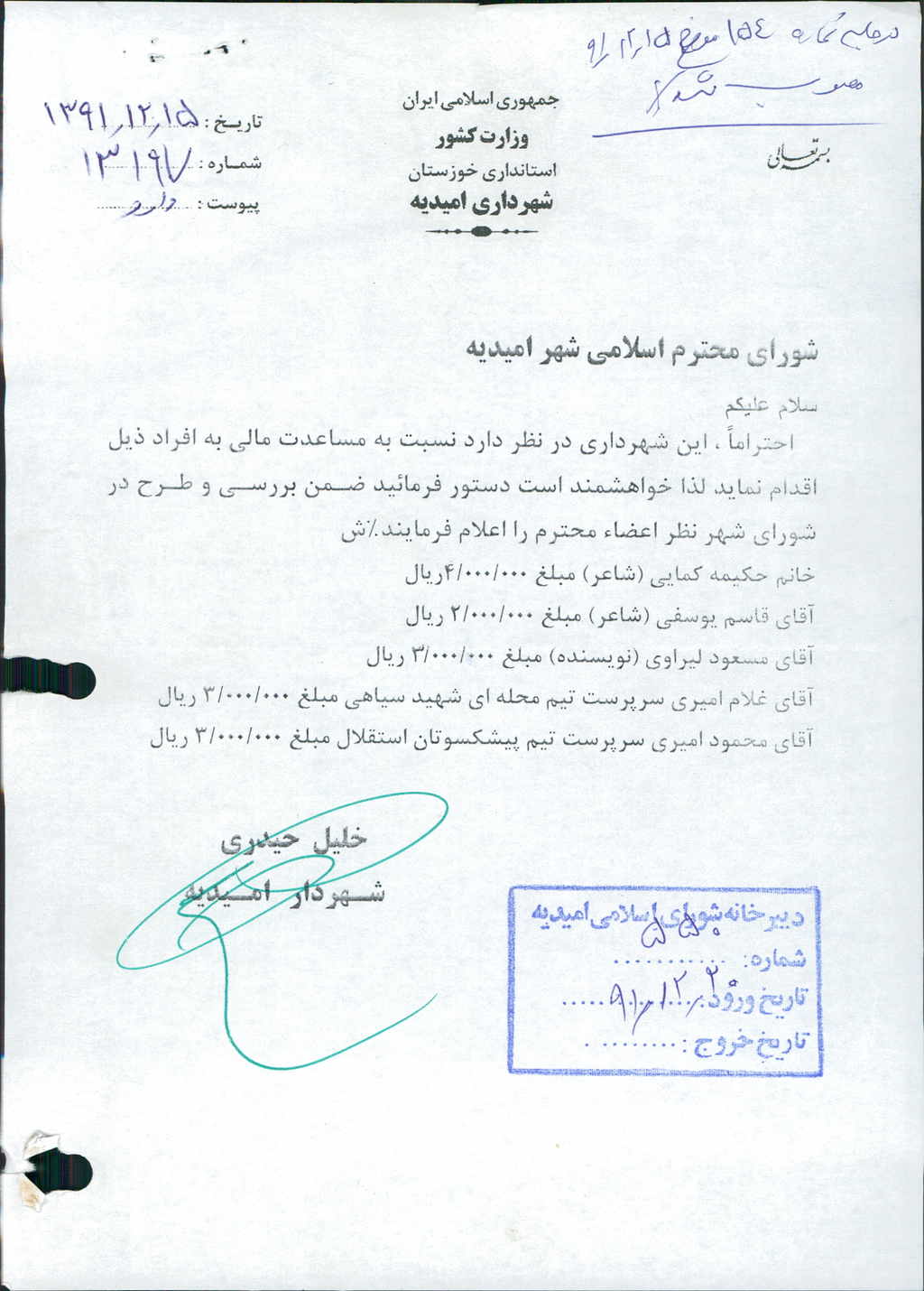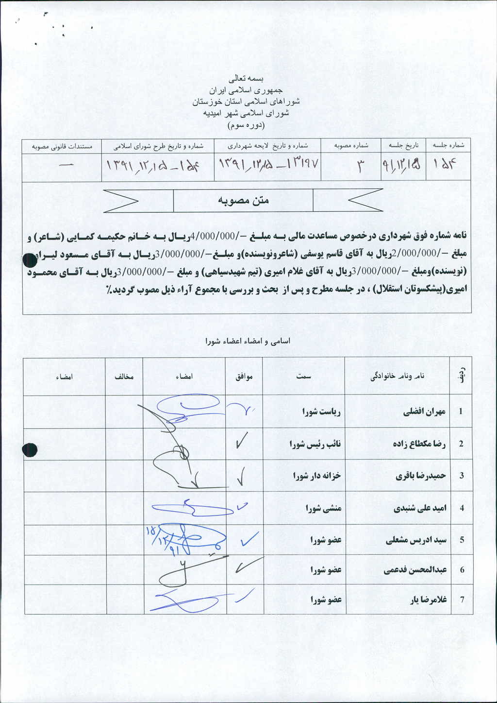 مصوبه شماره ۳ جلسه شماره ۱۵۴ مورخ ۹۱/۱۲/۱۵ شورای اسلامی شهر امیدیه