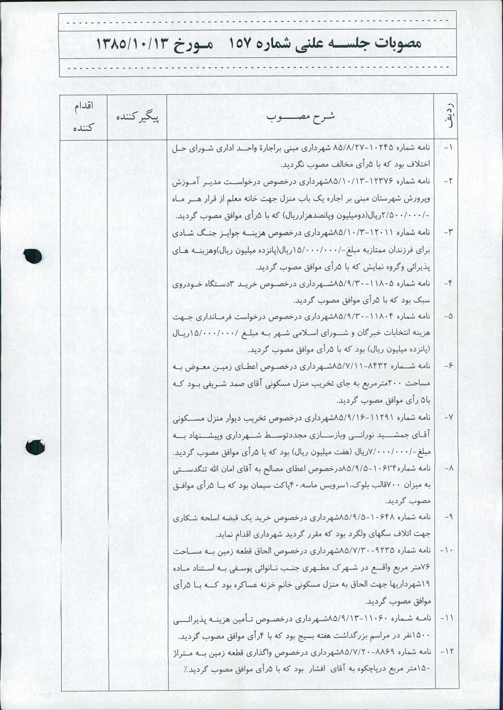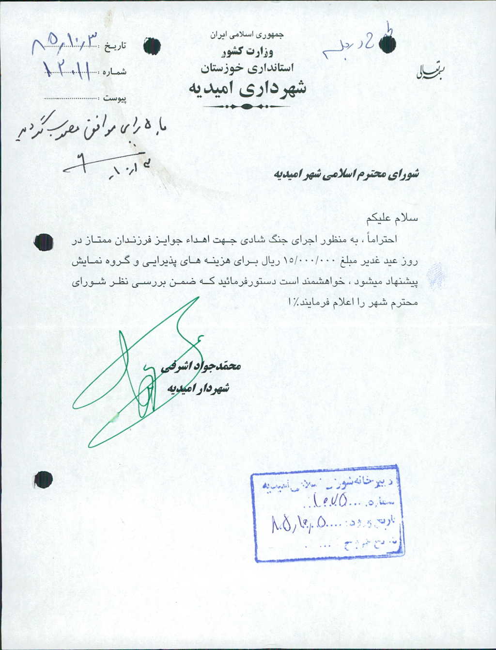 مصوبه شماره ۳ جلسه شماره ۱۵۷ شورای اسلامی شهر امیدیه