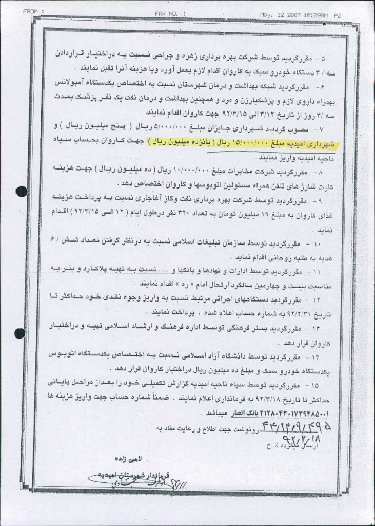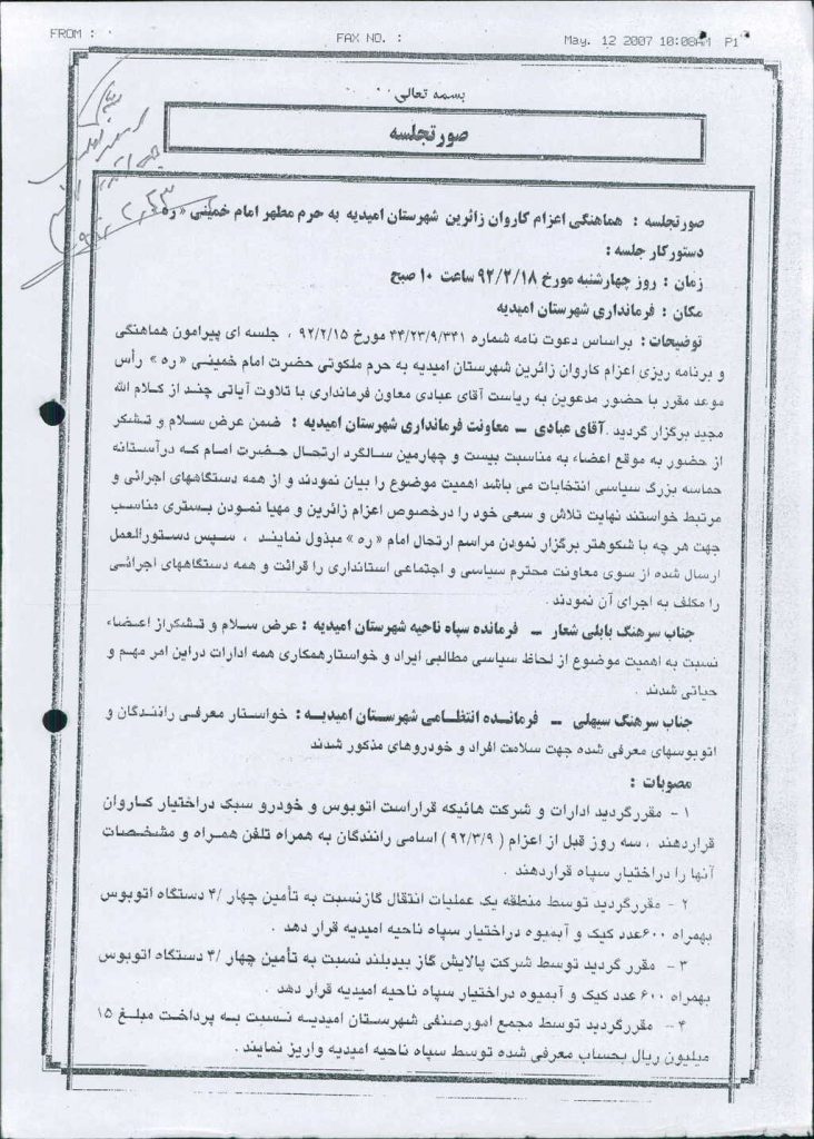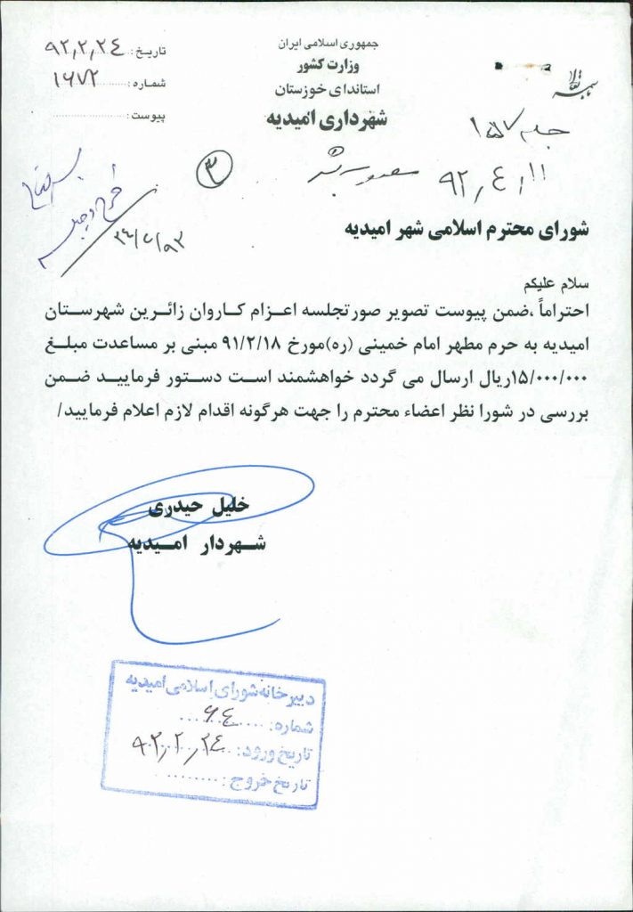 نامه شماره فوق مبنی بر اینکه شهرداری در نظر دارد بنا به  صورتجلسه اعزام کاروان زائرین شهرستان امیدیه به حرم مطهر امام خمینی (ره) مورخ ۱۸/ ۲/ ۹۲ مبنی بر درخواست مساعدت مبلغ ۰۰۰/۰۰۰/ ۱۵ريال پرداخت  نمايد كه موضوع در جلسه مطرح و پس از بحث و بررسی با مجموع آراء ذیل مصوب گردید%
