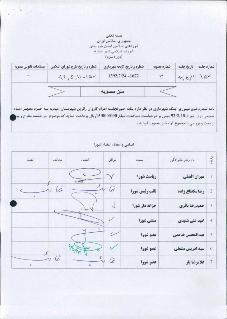 مصوبه شماره ۳ جلسه شماره ۱۵۷ شورای اسلامی شهر امیدیه