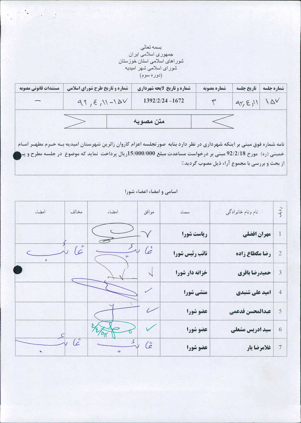 مصوبه شماره ۳ جلسه شماره ۱۵۷ مورخ ۹۲/۴/۱۱ شورای اسلامی شهر امیدیه