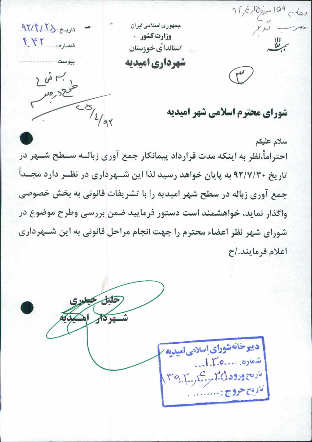 نامه شماره فوق شهرداری با عنایت به اتمام قرارداد پیمانکار جمع آوری زباله سطح شهر در تاریخ ۳۰/ ۷/ ۹۲ ، شهرداری در نظر دارد نسبت به واگذاری این امر به بخش خصوصی با تشریفات قانونی اقدام نماید که پس از طرح در جلسه با مجموع آراء ذیل مصوب گردید%