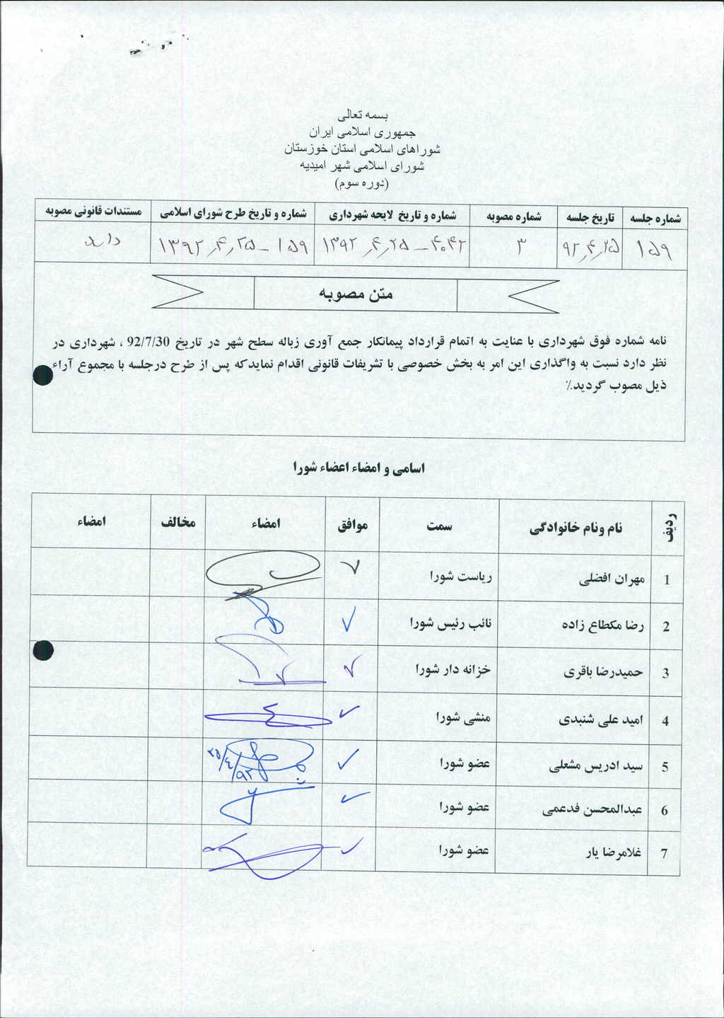 مصوبه شماره ۳ جلسه شماره ۱۵۹ شورای اسلامی شهر امیدیه
