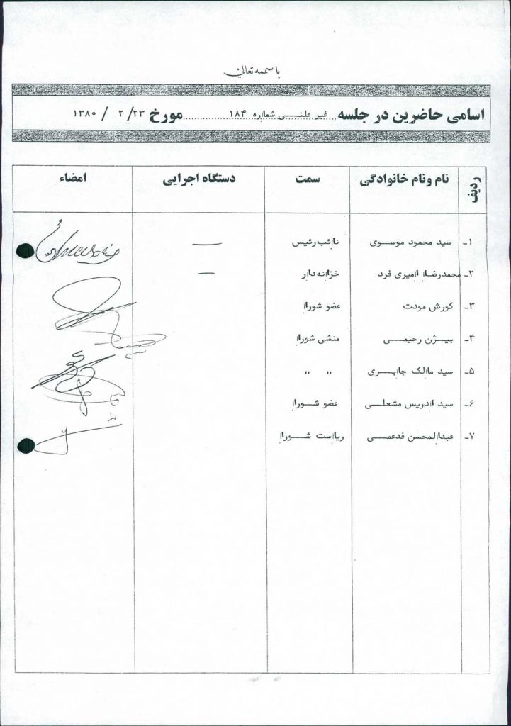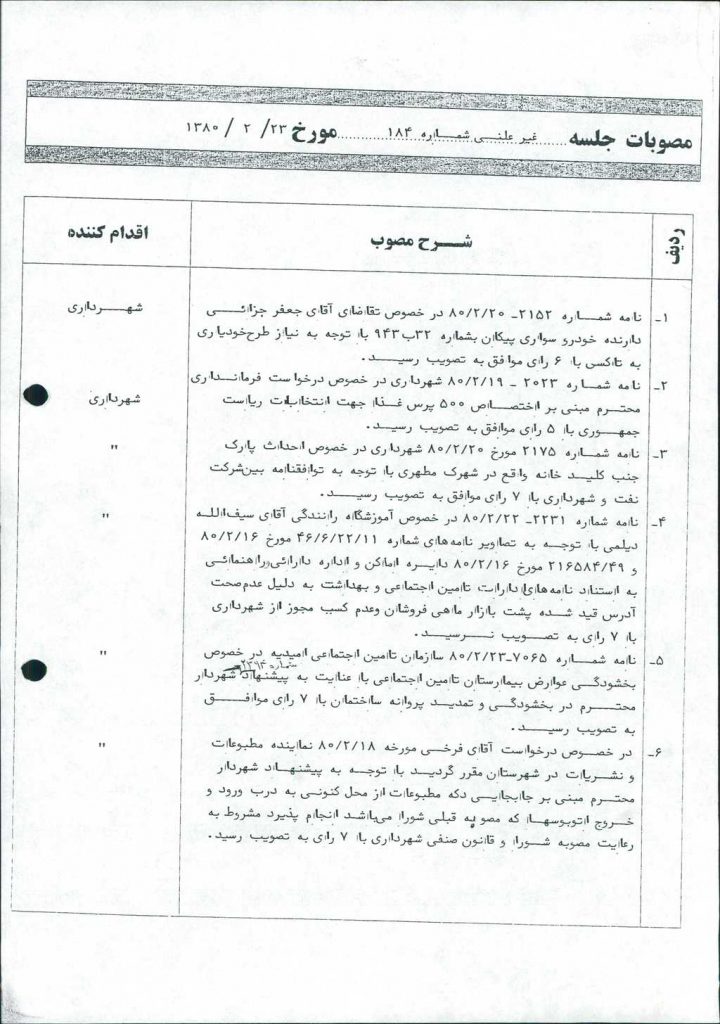 مصوبه شماره ۳ جلسه شماره ۱۸۴ شورای اسلامی شهر امیدیه