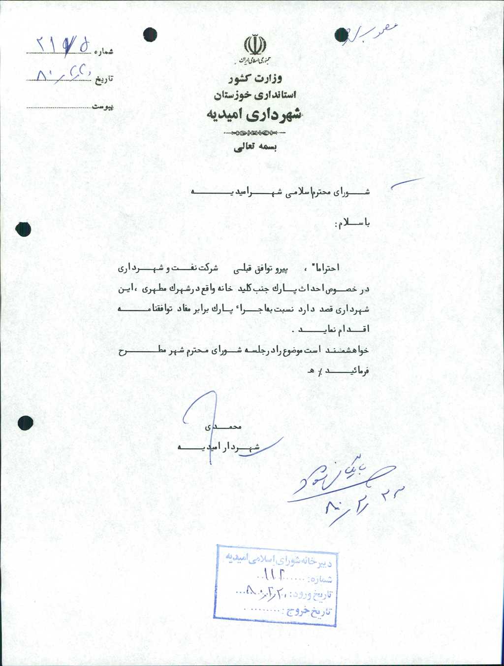 ۳-نامه شماره ۲۱۷۵مورخ۲۰/ ۲/ ۸۰ شهرداری در خصوص احداث پارک جنب کلیدخانه واقع در شهرک مطهری با توجه به توافقنامه بین شرکت نفت و شهرداری با ۷ رأی موافق به تصویب رسید.