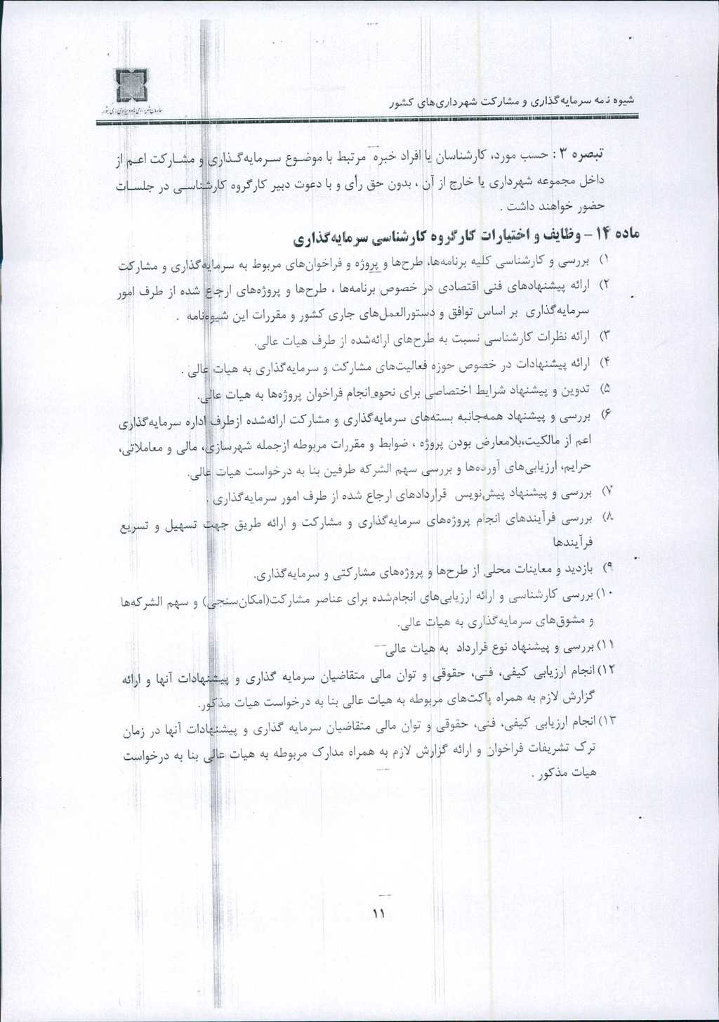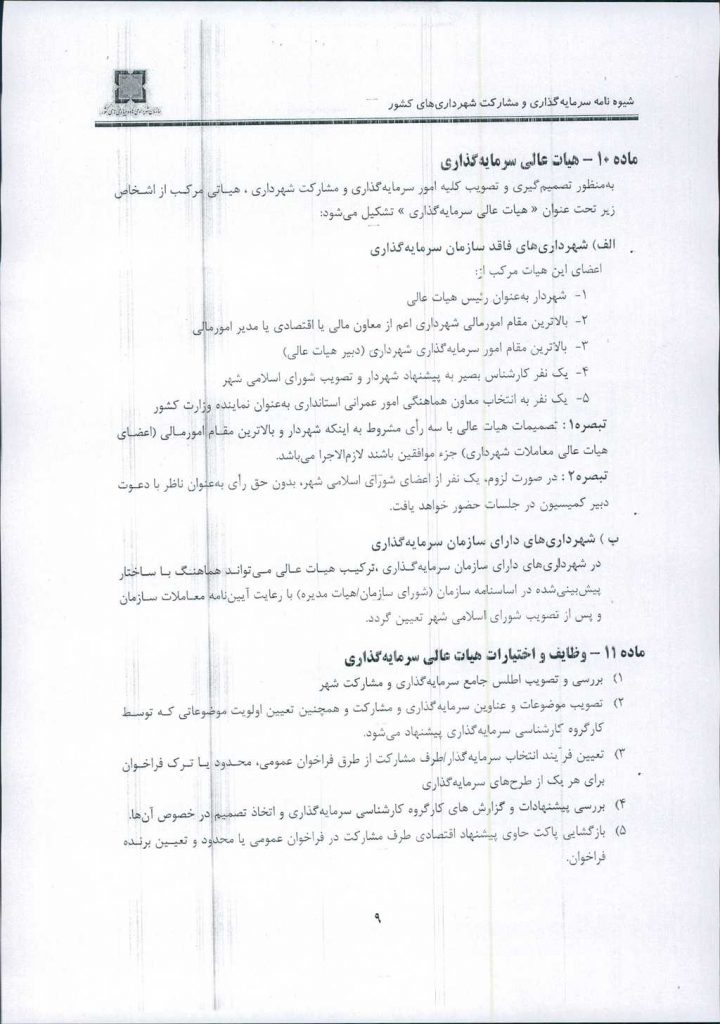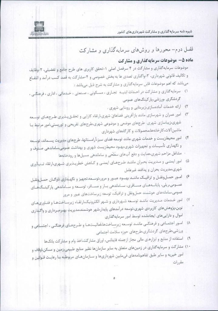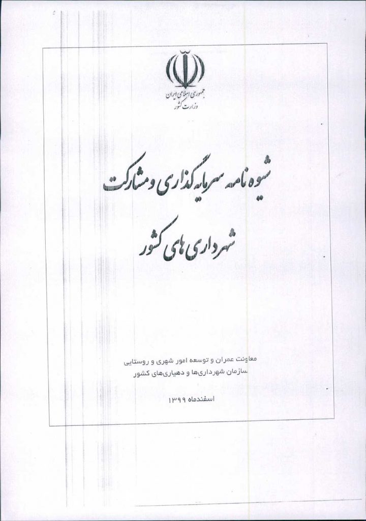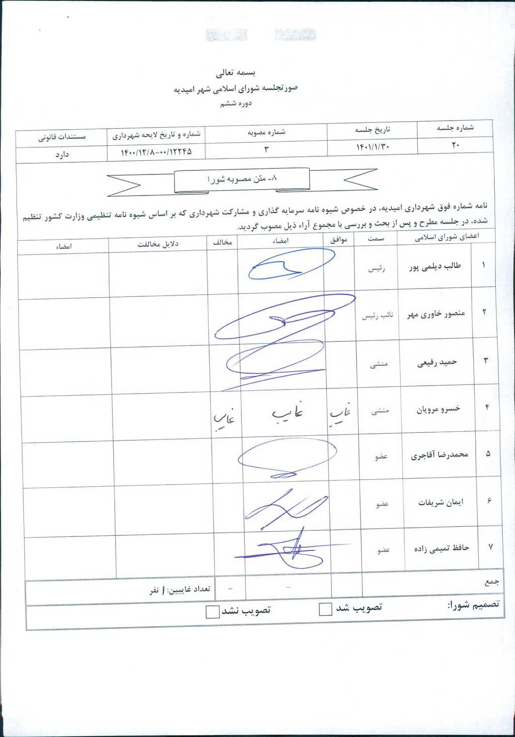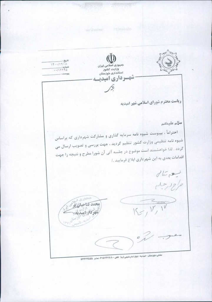 نامه شماره فوق شهرداری امیدیه، در خصوص شیوه نامه سرمایه گذاری و مشارکت شهرداری که بر اساس شیوه نامه تنظیمی وزارت کشور تنظیم شده، در جلسه مطرح و پس از بحث و بررسی با مجموع آراء ذیل مصوب گردید.