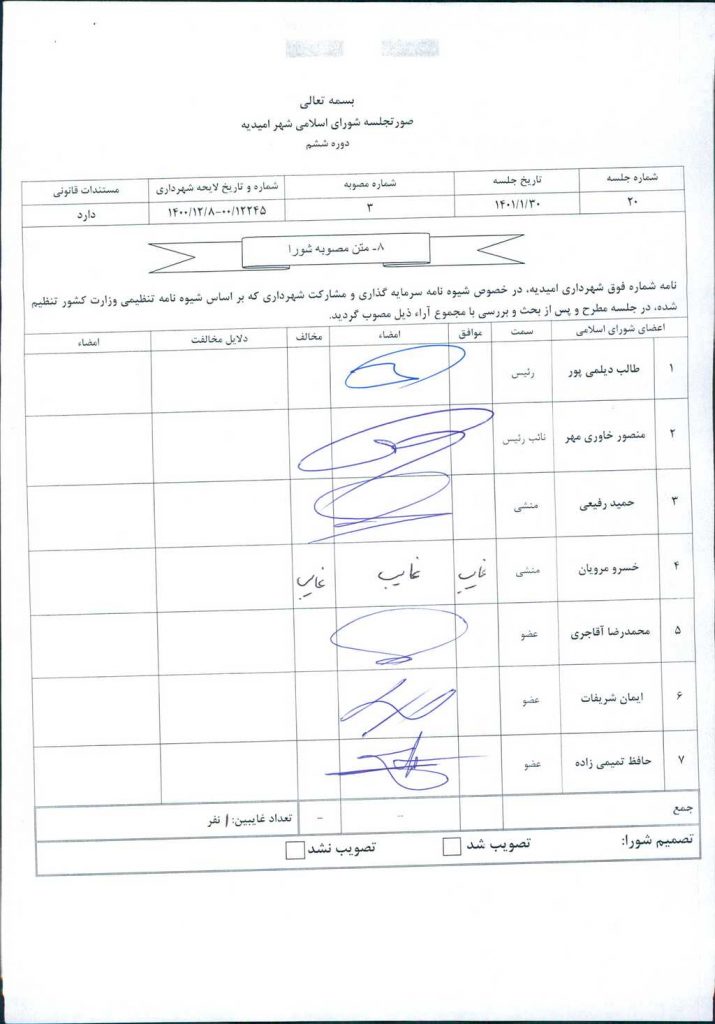 مصوبه شماره ۳ جلسه شماره ۲۰ شورای اسلامی شهر امیدیه
