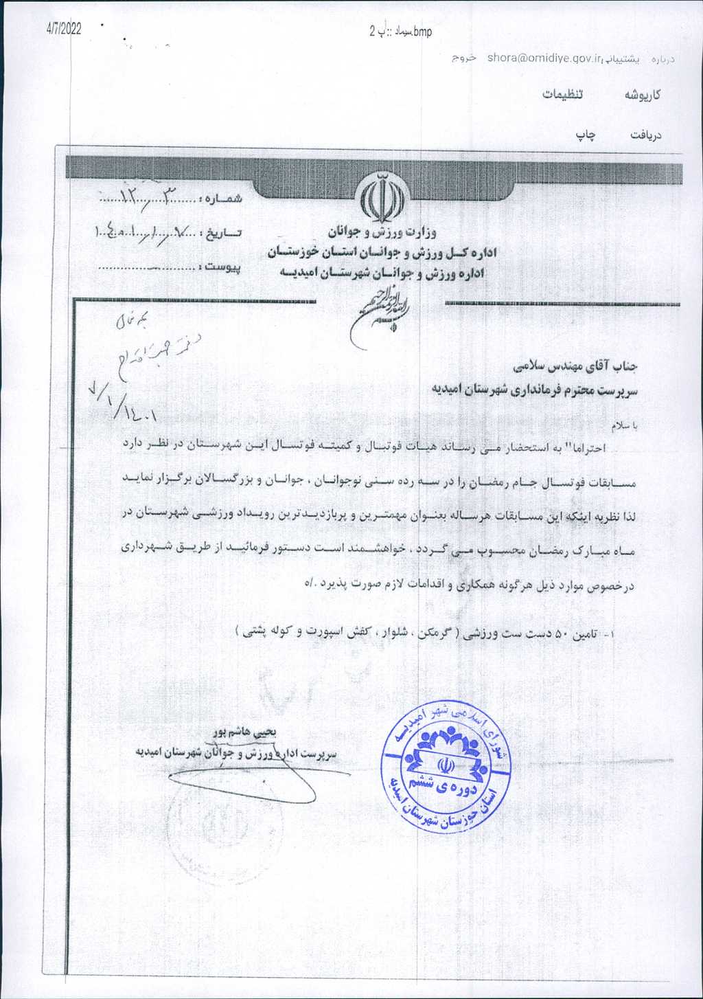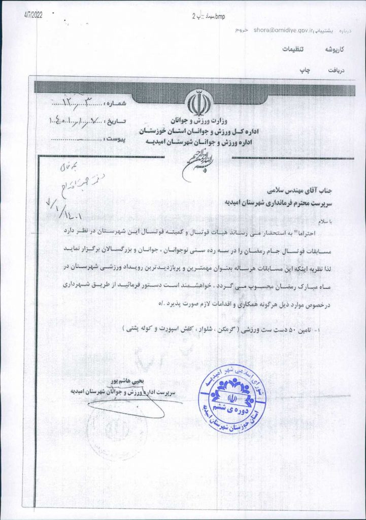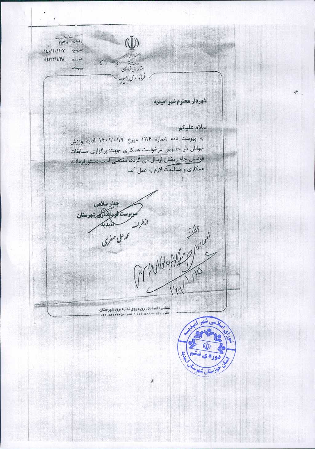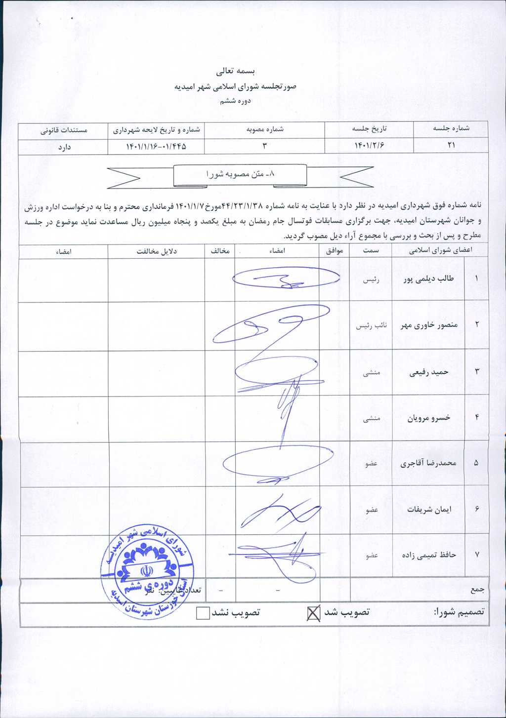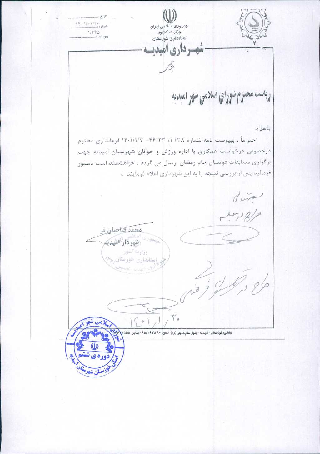 نامه شماره فوق شهرداری امیدیه در نظر دارد با عنایت به نامه شماره ۳۸/ ۱/ ۲۳/ ۴۴مورخ۷/ ۱/ ۱۴۰۱ فرمانداری محترم و بنا به درخواست اداره ورزش و جوانان شهرستان امیدیه، جهت برگزاری مسابقات فوتسال جام رمضان به مبلغ یکصد و پنجاه میلیون ریال مساعدت نماید موضوع در جلسه مطرح و پس از بحث و بررسی با مجموع آراء ذیل مصوب گردید.