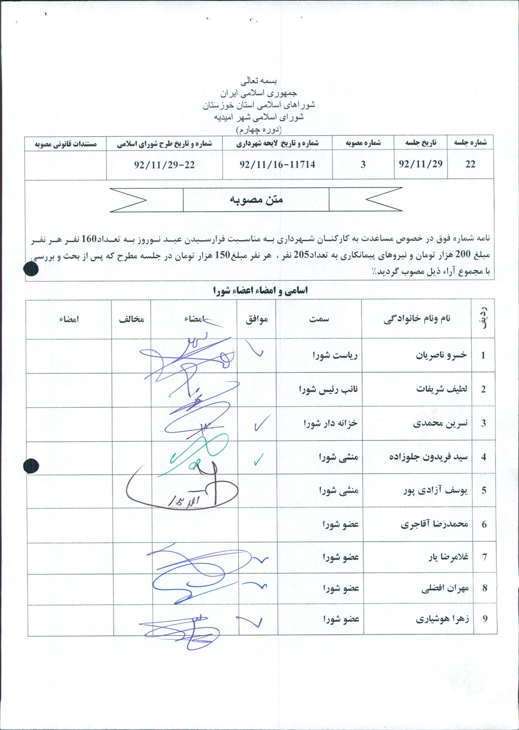 مصوبه شماره ۳ جلسه شماره ۲۲ شورای اسلامی شهر امیدیه