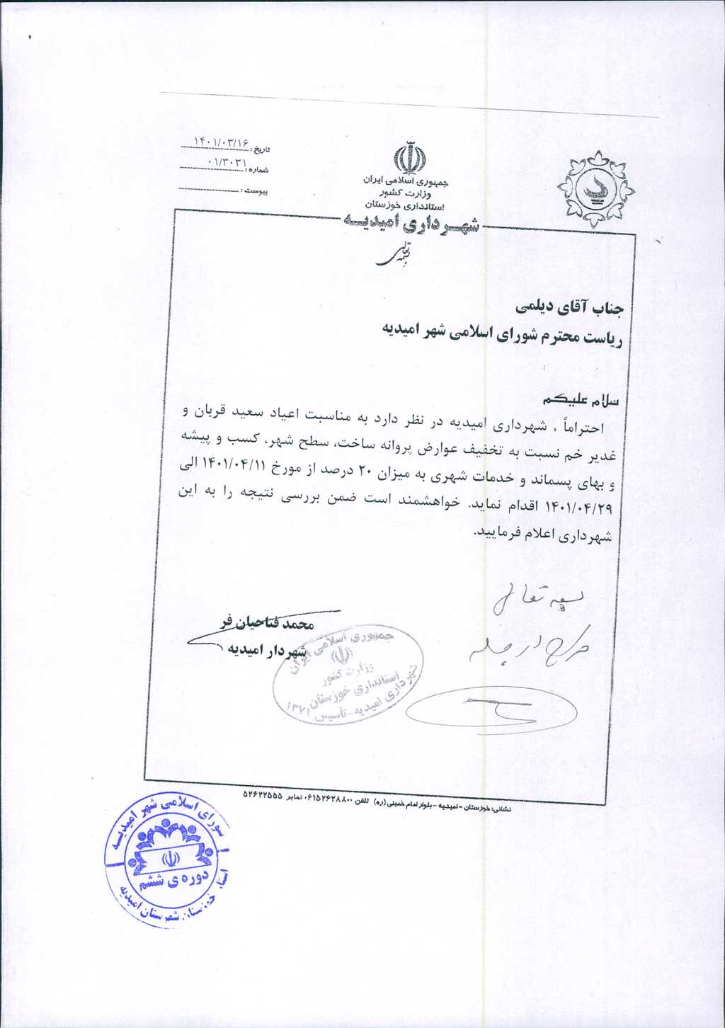 نامه شماره فوق مبنی براینکه شهرداری در نظردارد به مناسبت عید سعید قربان و عید غدیر خم نسبت به تخفیف عوارض پروانه ساخت، سطح شهر کسب و پیشه و بهای پسماند و خدمات شهری به میزان ۲۰درصد از تاریخ ۱۱/ ۴/ ۱۴۰۱ الی ۲۹/ ۴/ ۱۴۰۱ اقدام نماید، موضوع در جلسه مطرح و پس از بحث و بررسی با مجموع آراء ذیل مصوب گردید.