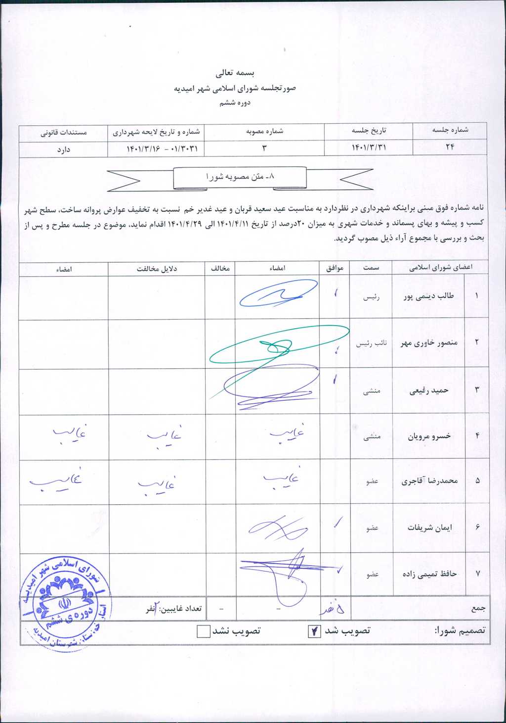 مصوبه شماره ۳ جلسه شماره ۲۴ شورای اسلامی شهر امیدیه