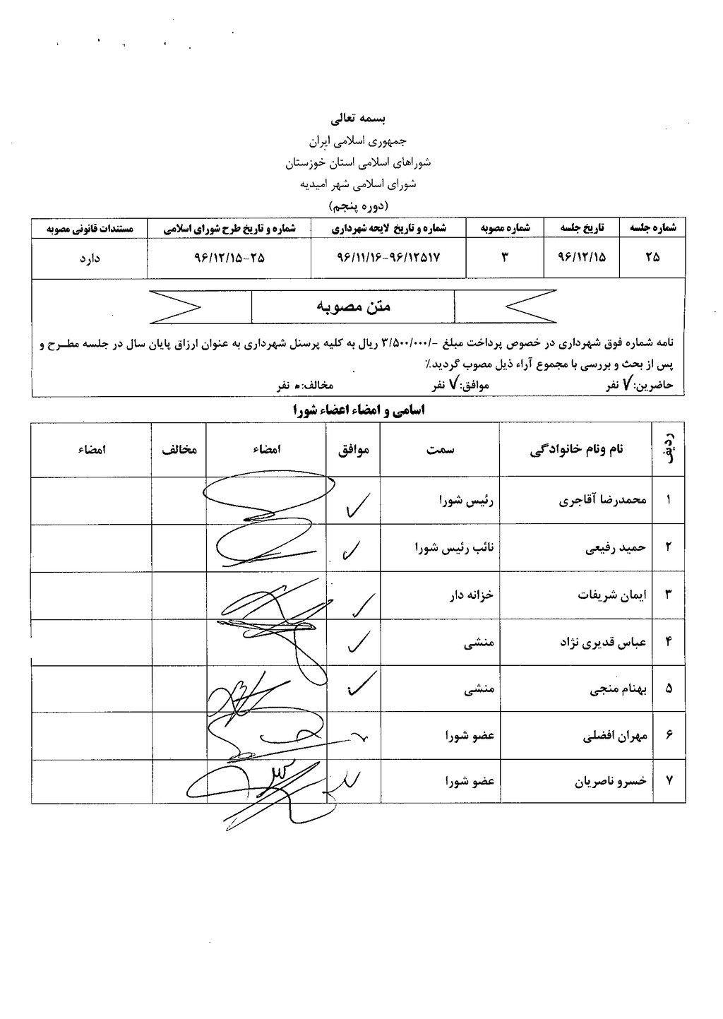 مصوبه شماره ۳ جلسه شماره ۲۵ مورخ ۹۶/۱۲/۱۵ شورای اسلامی شهر امیدیه