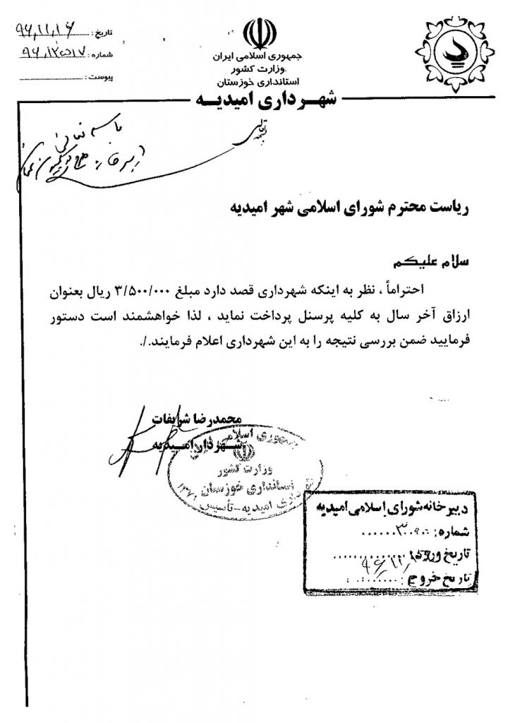 مصوبه شماره ۳ جلسه شماره ۲۵ شورای اسلامی شهر امیدیه