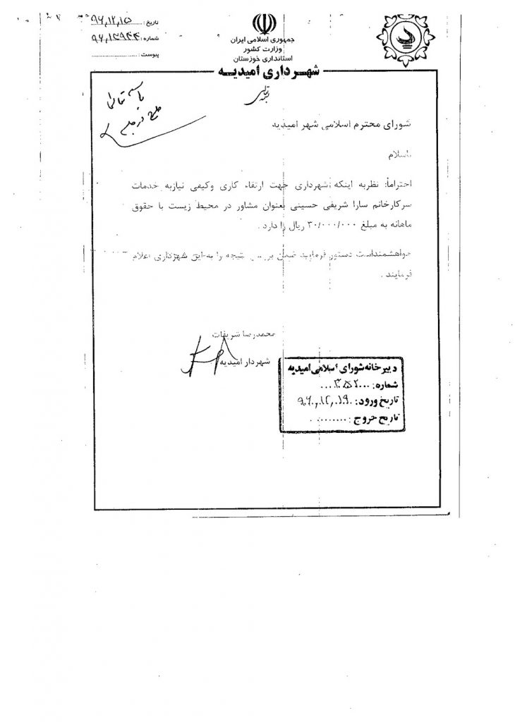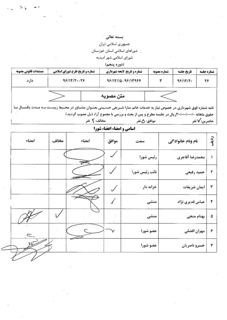 نامه شماره فوق شهرداری در خصوص نیاز به خدمات خانم سارا شریفی حسینی بعنوان مشاور در محیط زیست به مدت یکسال با حقوق ماهانه ۳۰۰۰۰۰۰۰ ریال در جلسه مطرح و پس از بحث و بررسی با مجموع آراء ذیل مصوب گردید%