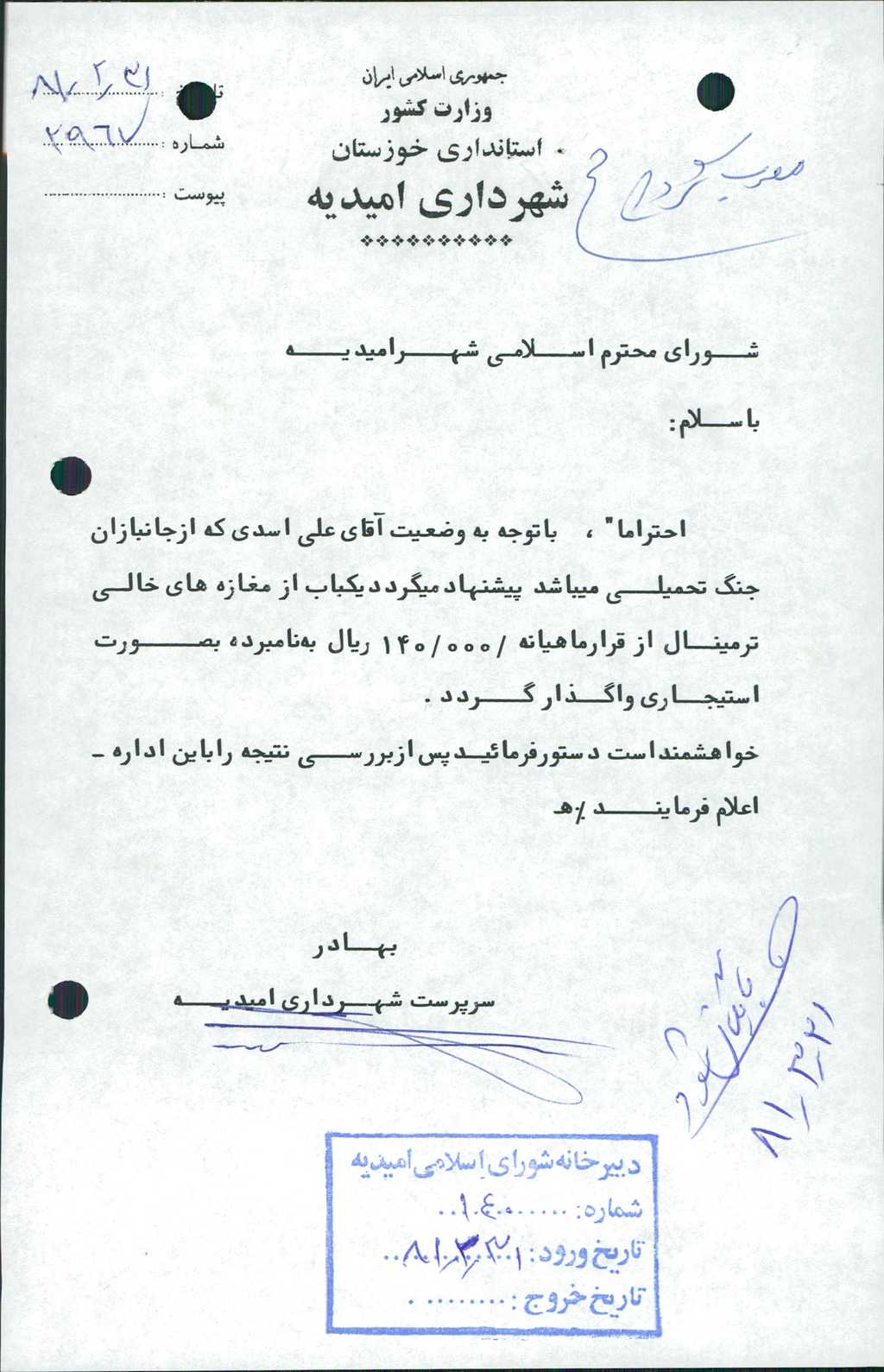 ۳-نامه شماره ۲۹۶۷ مورخه۳۱/ ۲/ ۸۱ شهرداري درخصوص اجـاره يك باب از مغازه هاي خالي ترمينال از قرارماهيانه ۰۰۰/ ۱۴۰ريال به جانباز جنگ تحميلي آقاي علي اسدي پس از بحث و بررسي بـا ۶رأي موافق به تصويب رسيـد.