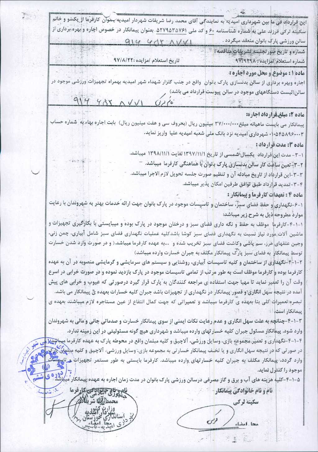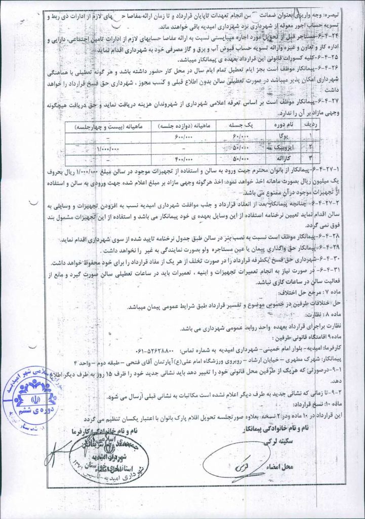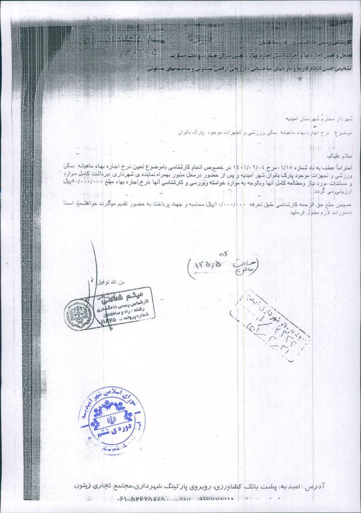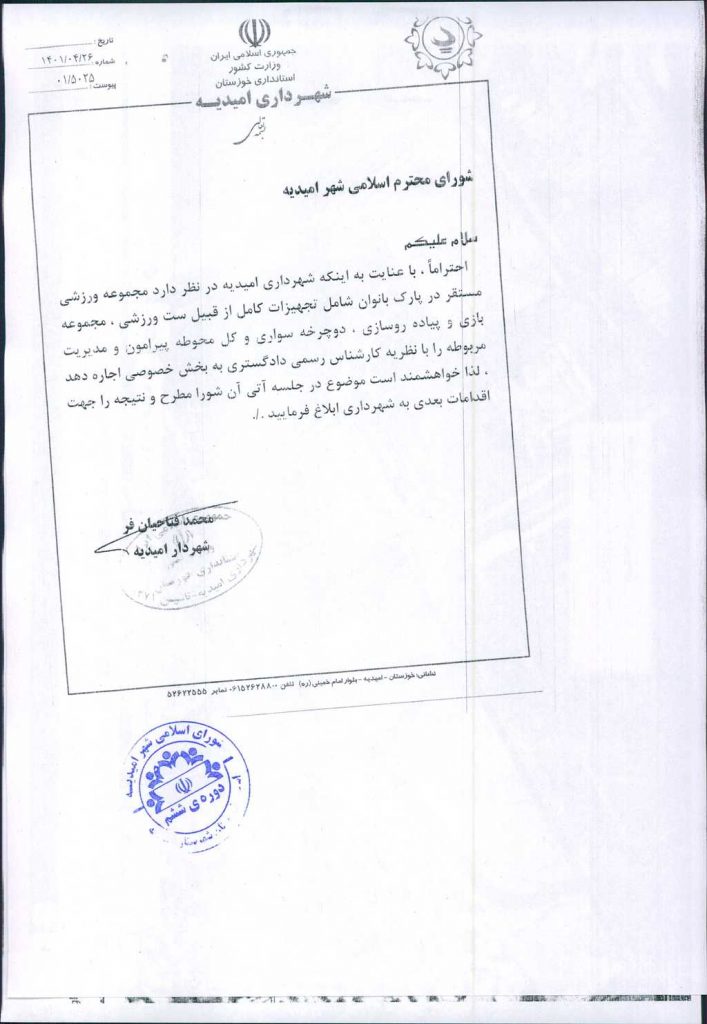 نامه شماره فوق مبنی بر اینکه شهرداری امیدیه در نظردارد بهره برداری ازمجموعه ورزشی مستقردرپارک بانوان که شامل تجهیزات کامل از قبیل ست ورزشی، مجموعه بازی و پیاده روی، دوچرخه سواری و کل محوطه پیرامون و مدیریت مربوطه را با نظریه کارشناس رسمی دادگستری از طریق مزایده عمومی به بخش خصوصی اجاره دهد، موضوع در جلسه مطرح و پس از بحث و بررسی با مجموع آراء ذیل مصوب گردید.