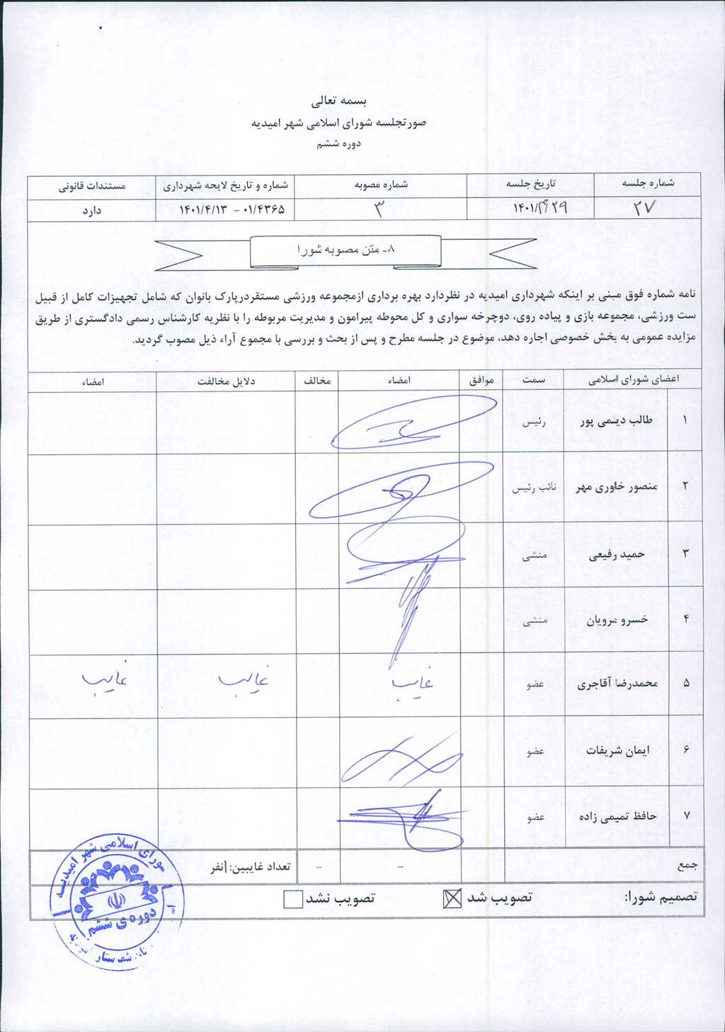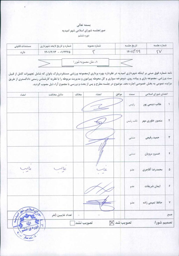مصوبه شماره ۳ جلسه شماره ۲۷ شورای اسلامی شهر امیدیه