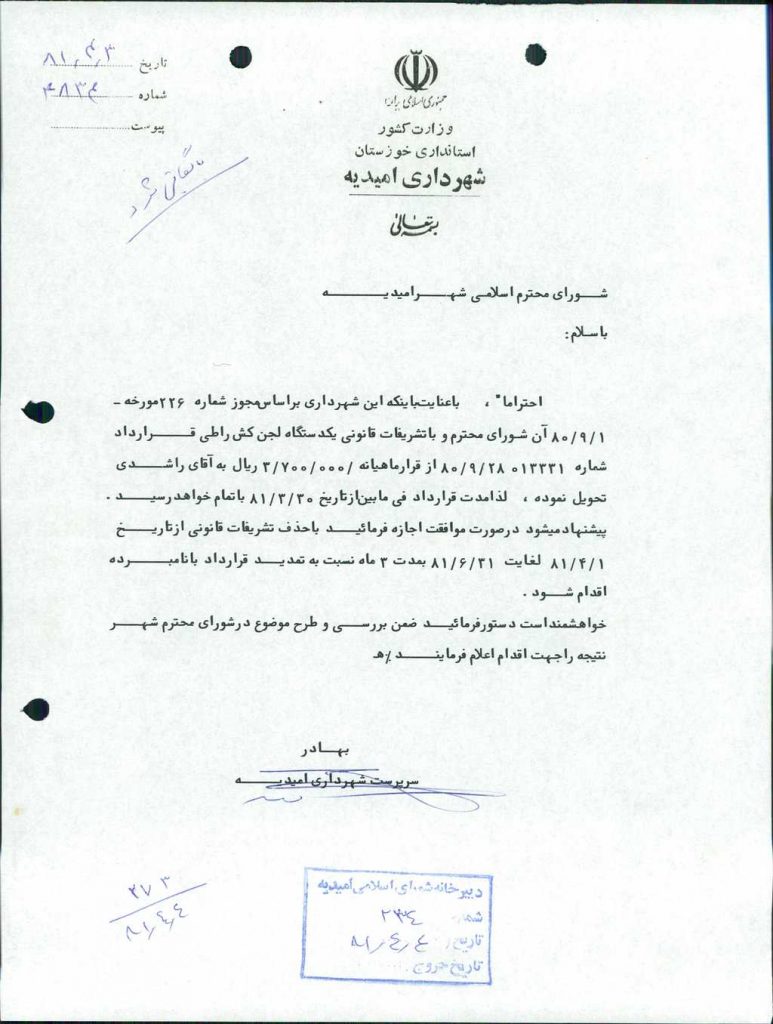 مصوبه شماره ۳ جلسه شماره ۲۷۳ مورخ ۸۱/۴/۴ شورای اسلامی شهر امیدیه